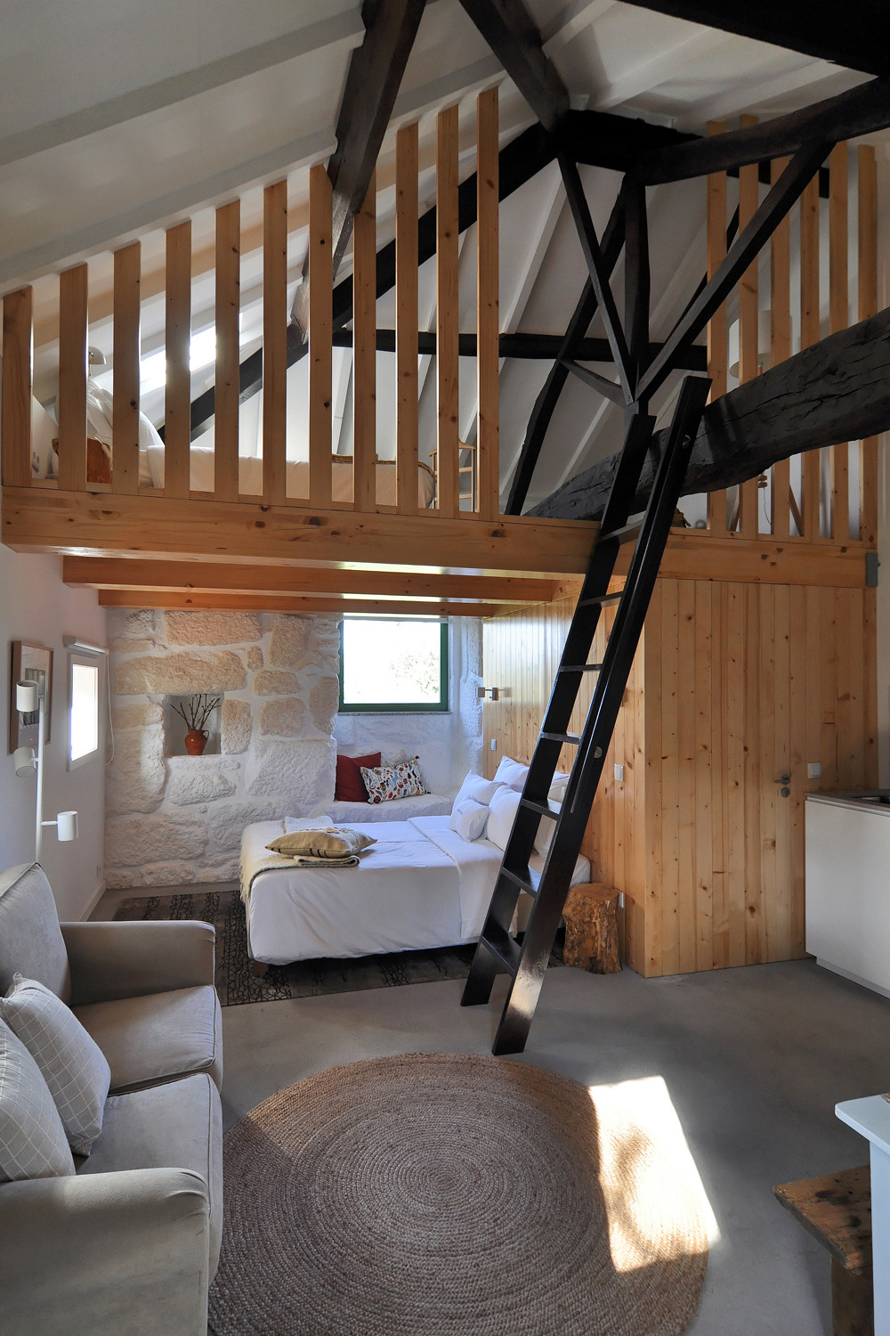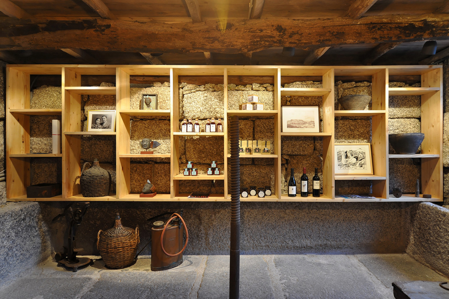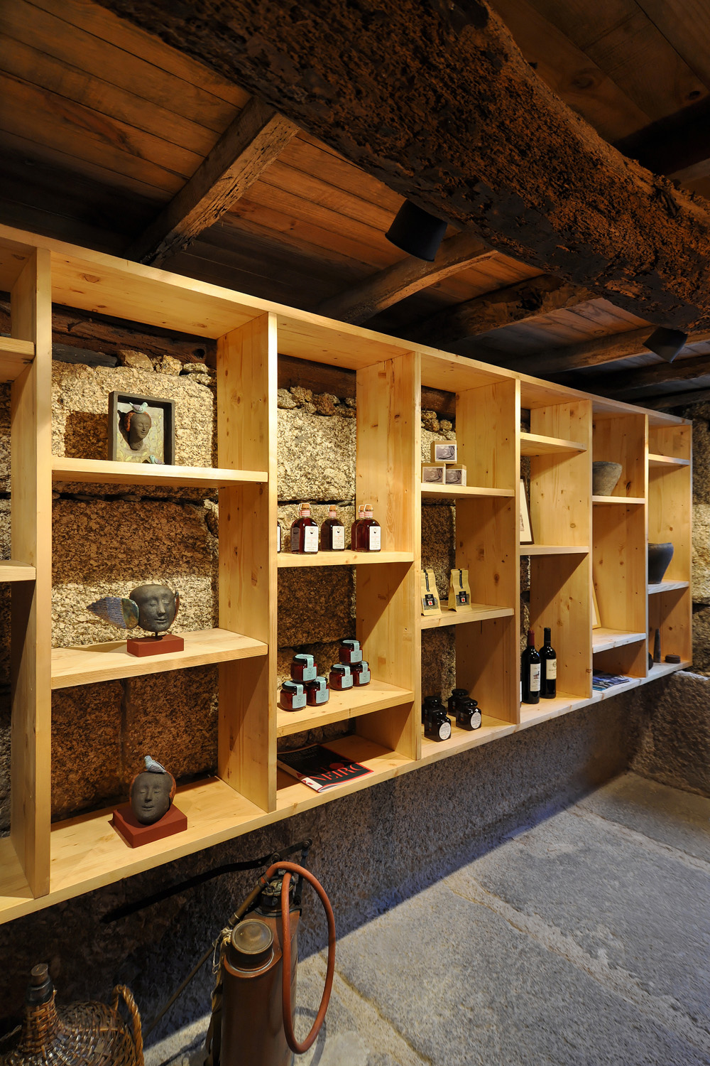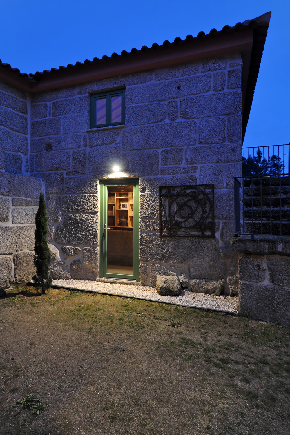 Intervention: When we visited the farm for the first time, we immediately apprehended the central terrace, with a triangular plan - around which the three buildings that make up the small agricultural nucleus gravitate -, as a privileged social space with a communitarian vocation, of circulation and distribution between the various areas of the property. This functional and representative core has at the same time an intimate character, its centrality being accentuated by a leafy fig tree which functions as a natural dome that tints the light and regulates the temperature, protecting the yard from the intense sun in the warmer months. The general intention of the architectural intervention was to maintain and emphasize the rural spirit already present in the built ensemble and its surroundings, eliminating the dissonant elements, from a stylistic and constructive point of view, that were added over time to the original constructions, preserving the characteristic solutions and seeking to ensure that the introduction of new elements did not detract from the overall image of the existing ones. The new program was organized by locating the service functions on the ground floor, taking advantage of its more direct relationship with the outdoor spaces, and the accommodation spaces on the upper floor, giving them greater privacy. In the treatment of the façades, it was decided to expose the granite stone apparatus whenever possible and an old pink pigment, evocative of the wild fruit culture and “brand image” of the owners’ agricultural production, was used, combining them with a nature inspired green tone on the new wooden frames. In the interiors special attention was paid to the enhancement of pre-existing elements, namely to the wooden structures of floors and roofs, to the ovens of the old kitchen and to the granite mill integrated in the new store/reception of the enterprise, with wood prevailing as the material of choice in the new elements introduced. Some elements of a more vernacular nature, already too deteriorated, were reinterpreted according to contemporary design and technique, with the intention of maintaining the spirit of the place and period of the original construction.