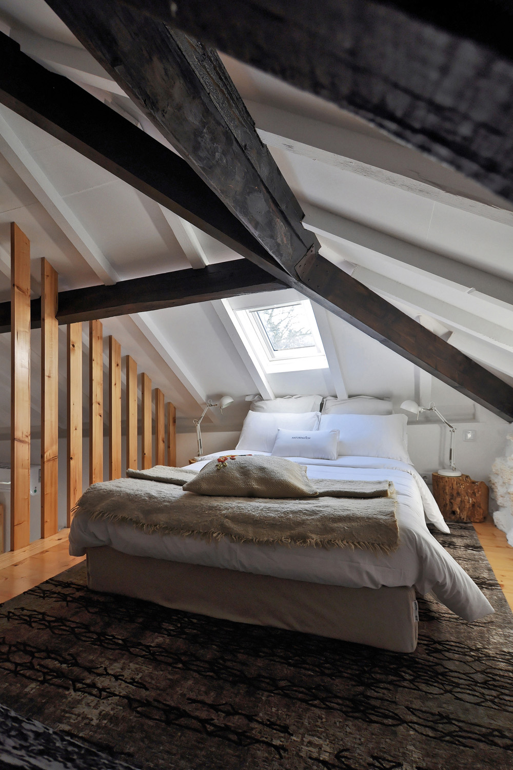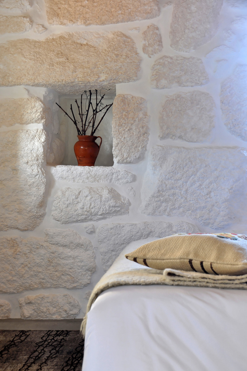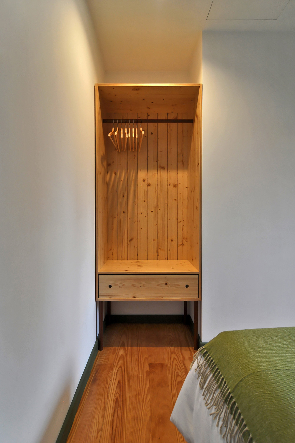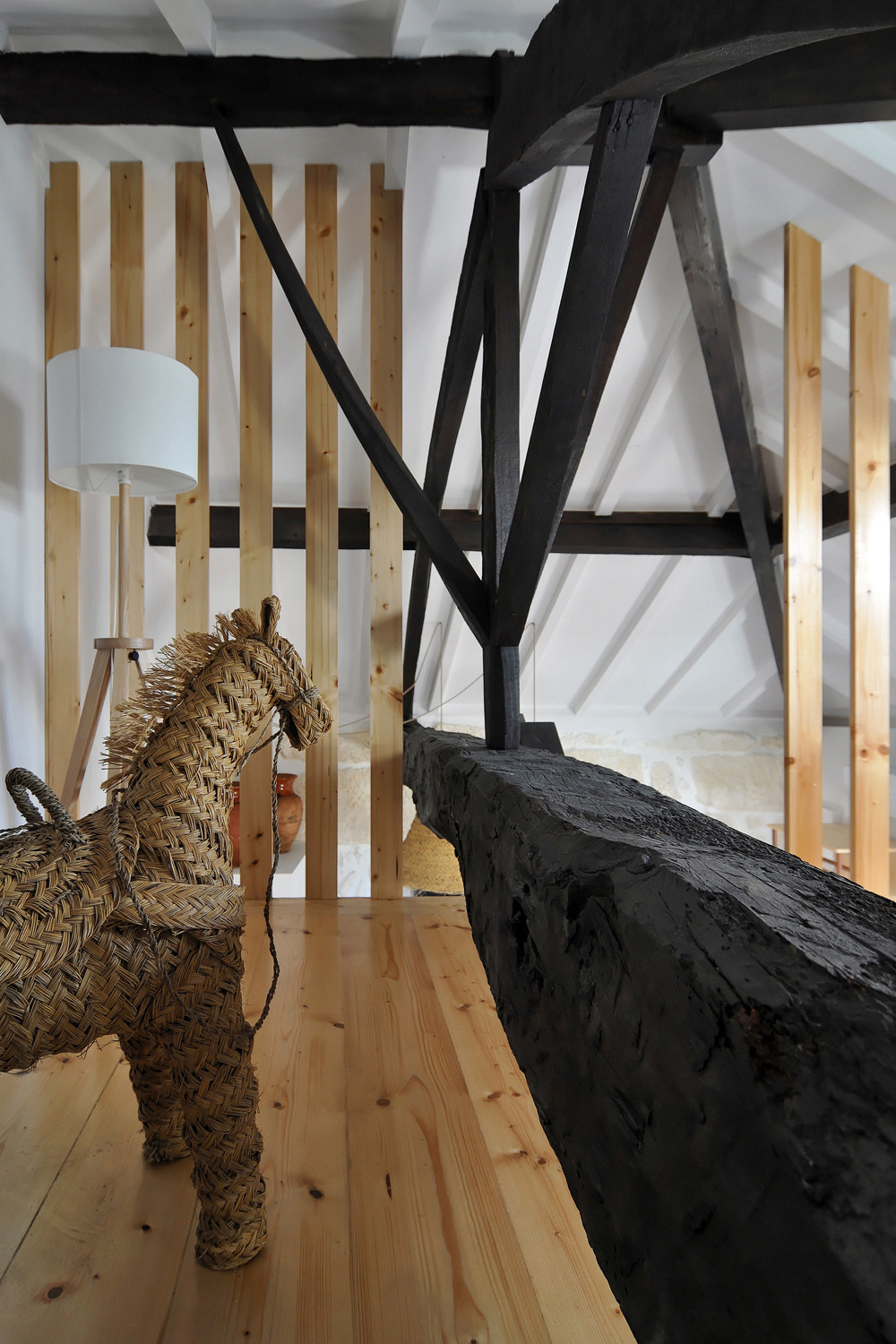 Intervention: When we visited the farm for the first time, we immediately apprehended the central terrace, with a triangular plan - around which the three buildings that make up the small agricultural nucleus gravitate -, as a privileged social space with a communitarian vocation, of circulation and distribution between the various areas of the property. This functional and representative core has at the same time an intimate character, its centrality being accentuated by a leafy fig tree which functions as a natural dome that tints the light and regulates the temperature, protecting the yard from the intense sun in the warmer months. The general intention of the architectural intervention was to maintain and emphasize the rural spirit already present in the built ensemble and its surroundings, eliminating the dissonant elements, from a stylistic and constructive point of view, that were added over time to the original constructions, preserving the characteristic solutions and seeking to ensure that the introduction of new elements did not detract from the overall image of the existing ones. The new program was organized by locating the service functions on the ground floor, taking advantage of its more direct relationship with the outdoor spaces, and the accommodation spaces on the upper floor, giving them greater privacy. In the treatment of the façades, it was decided to expose the granite stone apparatus whenever possible and an old pink pigment, evocative of the wild fruit culture and “brand image” of the owners’ agricultural production, was used, combining them with a nature inspired green tone on the new wooden frames. In the interiors special attention was paid to the enhancement of pre-existing elements, namely to the wooden structures of floors and roofs, to the ovens of the old kitchen and to the granite mill integrated in the new store/reception of the enterprise, with wood prevailing as the material of choice in the new elements introduced. Some elements of a more vernacular nature, already too deteriorated, were reinterpreted according to contemporary design and technique, with the intention of maintaining the spirit of the place and period of the original construction.
