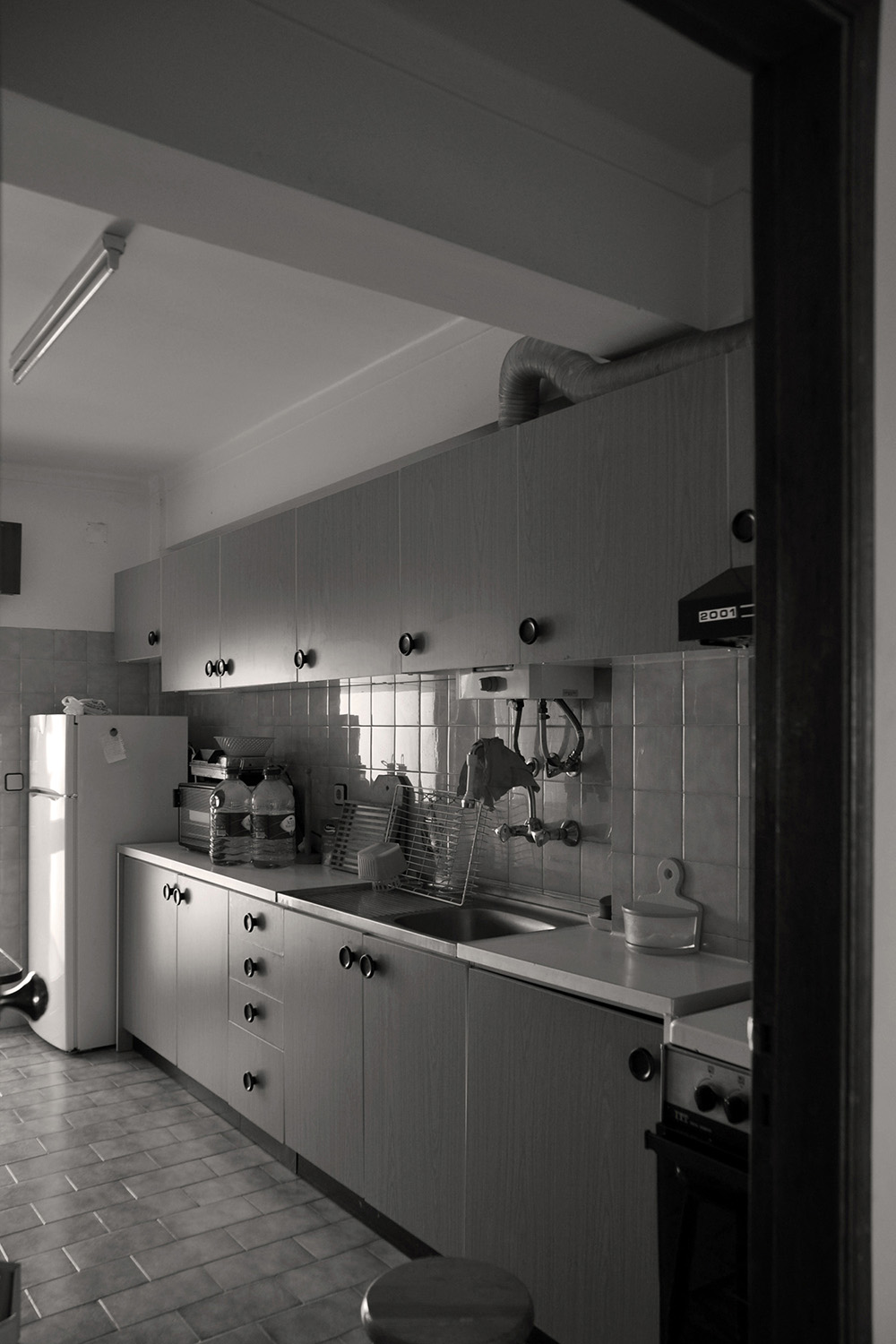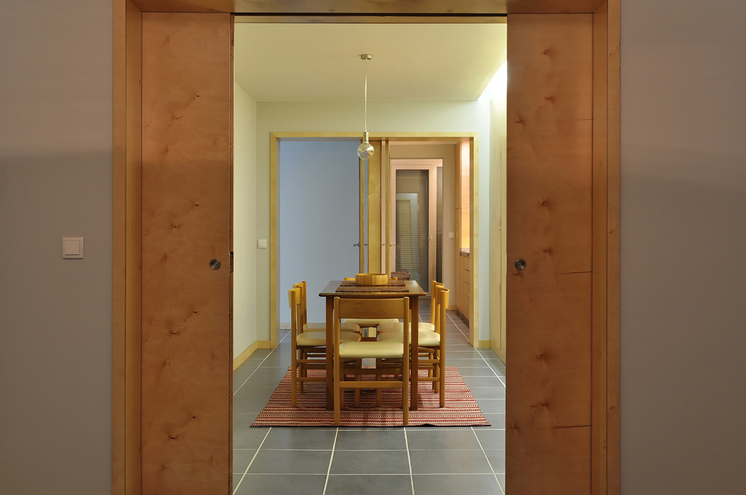 Compartmentalization was redefined and the new spaces were designed based on a principle of functional and geometric clarification, in tune with the structure and infrastructure of the building: the kitchen and the laundry room became more compact; the only existing Sanitary Installation was transformed into two smaller ones, one articulated with the Entrance Hall and serving the common areas and the other in relation to the corridor that gives access to the bedrooms; the Dining Room has been reshaped into the central core of the house and the Living Room has gained an extra function allowing it to be transformed into a real bedroom by introducing a set of concealed sliding panels inside the walls. The repositioning of the built-in furniture and the reduction of the areas exclusively destined for circulation allowed to increase the sense of amplitude of the main spaces.