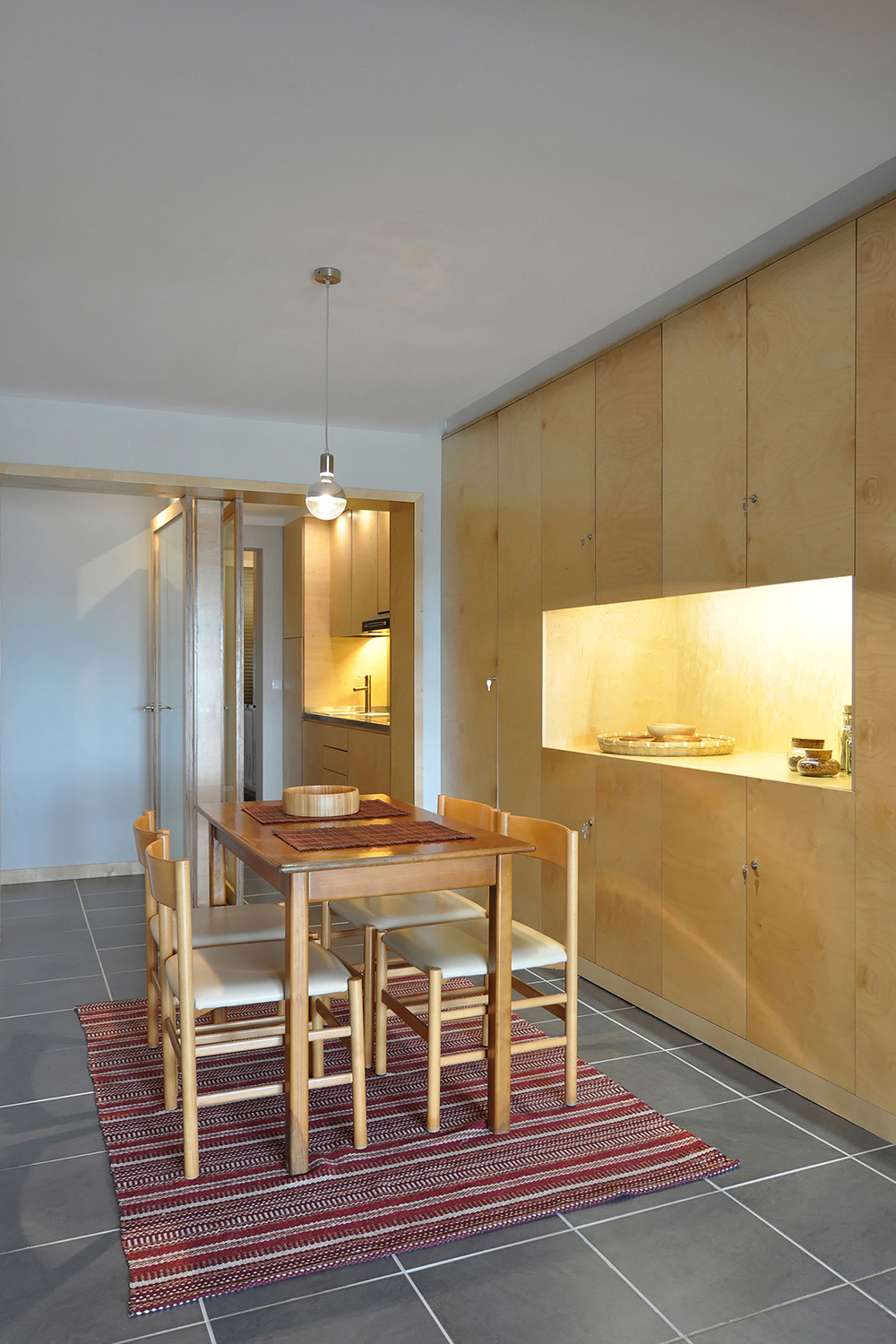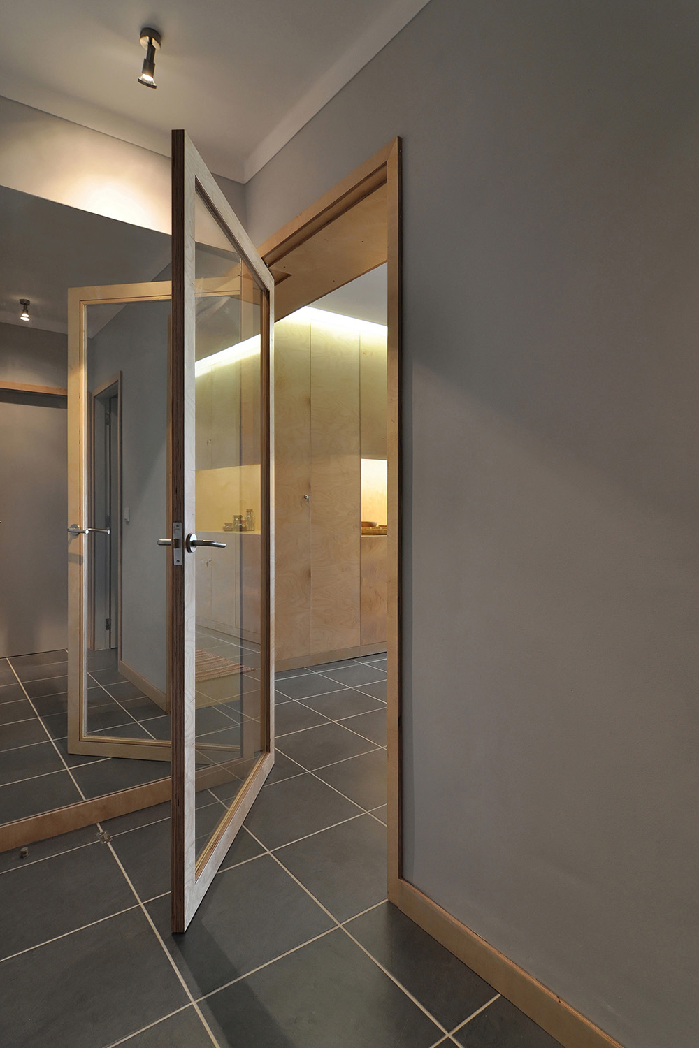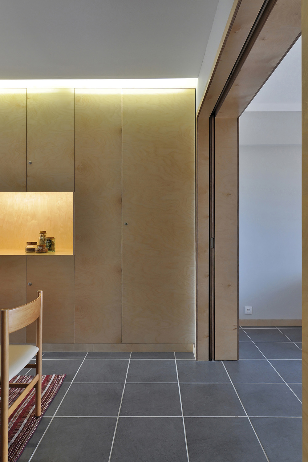 With regard to the environments, we intended to make them more serene and welcoming, without neglecting the resistance and functionality of the materials in relation to the coastal location of the property and its use for beach related holidays. With this in mind, a palette of colors and neutral materials were chosen in order to give tactile and visual comfort to the spaces: birch maritime plywood for its excellent performance against humidity and its light but warm tone for all carpentry, walls and doors painted light gray in order to tint the intense Algarve light and the ceramic flooring of dark gray tones to make a contrasting effect.