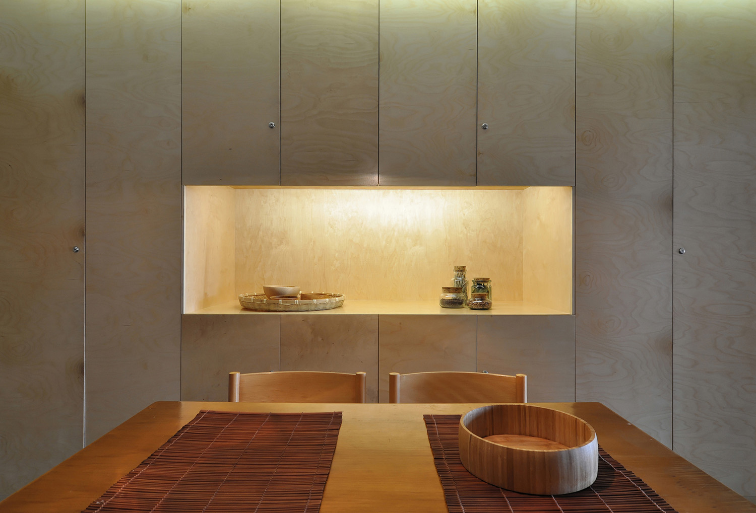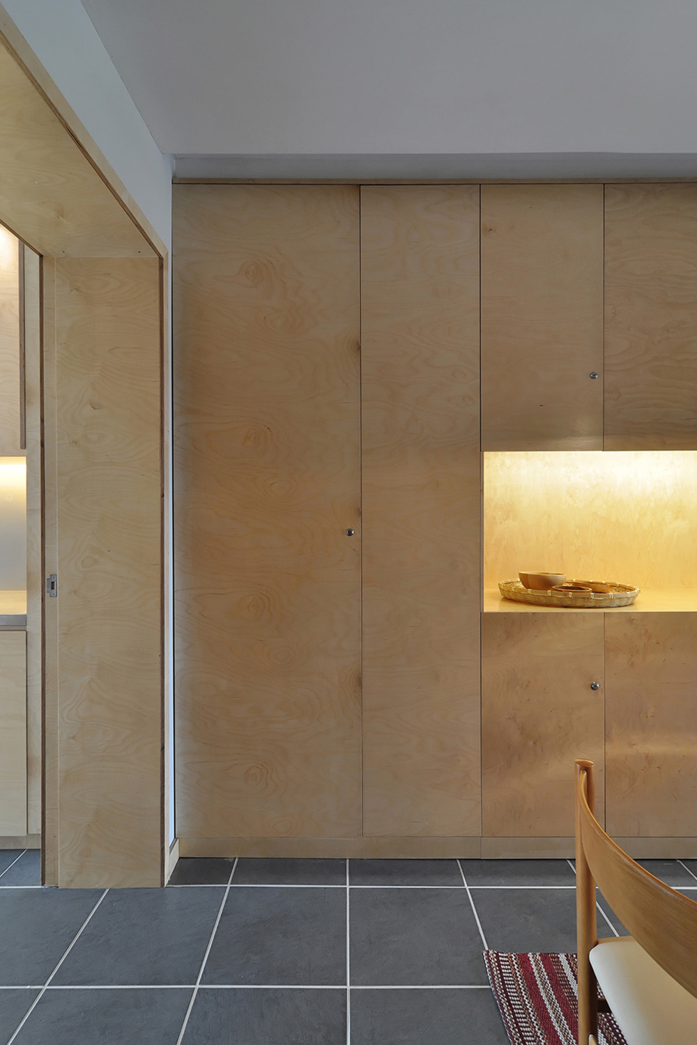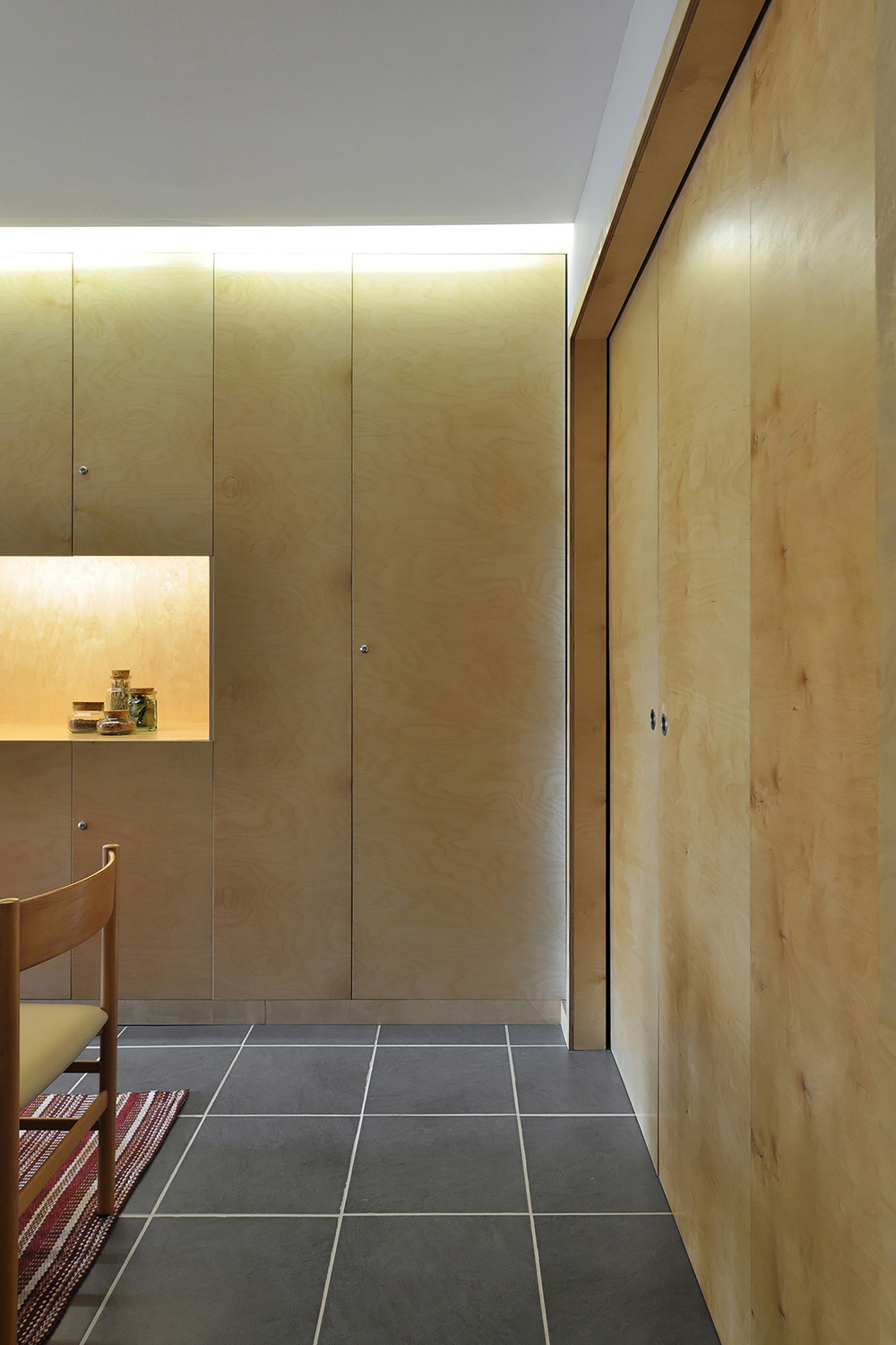 With regard to the environments, we intended to make them more serene and welcoming, without neglecting the resistance and functionality of the materials in relation to the coastal location of the property and its use for beach related holidays. With this in mind, a palette of colors and neutral materials were chosen in order to give tactile and visual comfort to the spaces: birch maritime plywood for its excellent performance against humidity and its light but warm tone for all carpentry, walls and doors painted light gray in order to tint the intense Algarve light and the ceramic flooring of dark gray tones to make a contrasting effect.