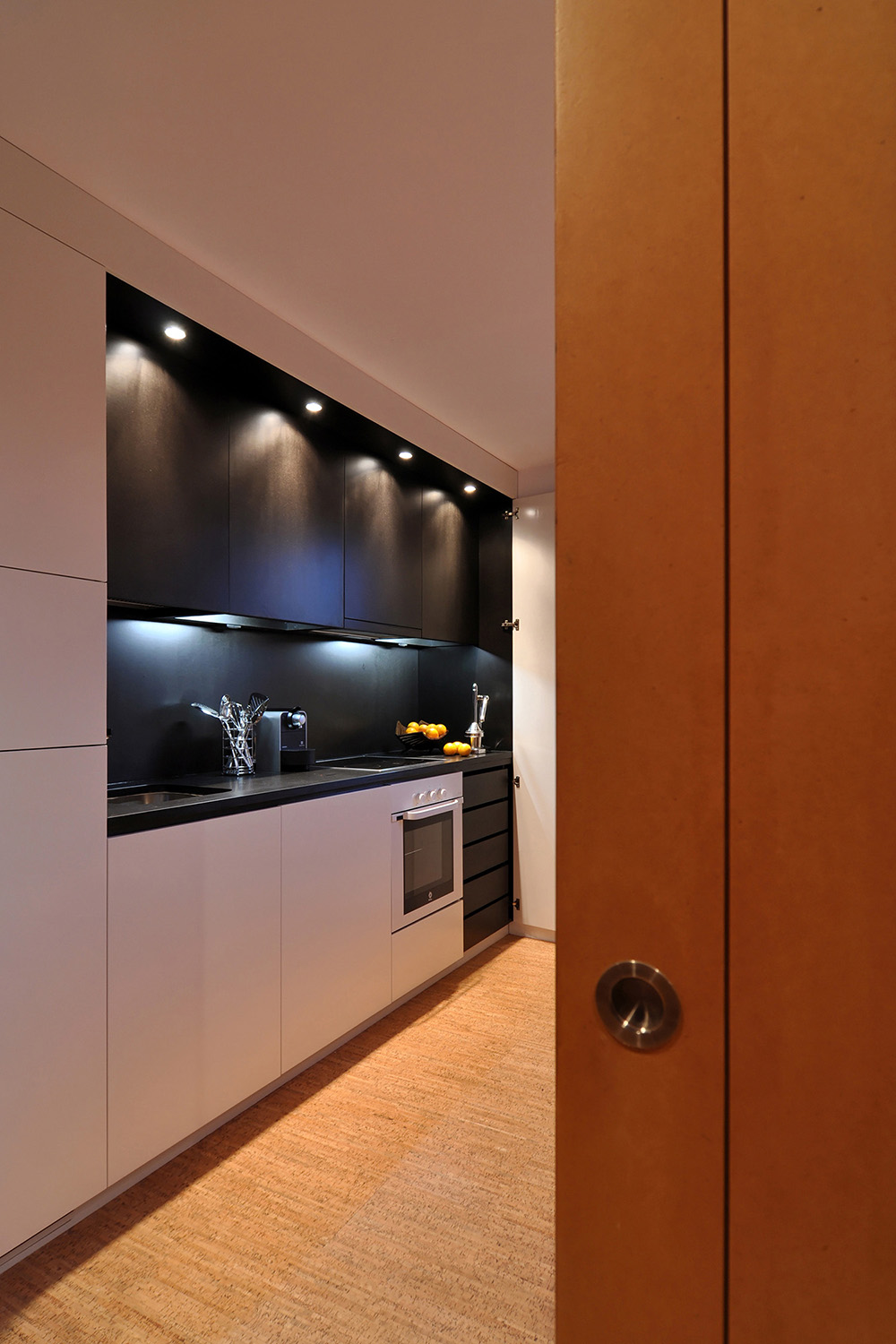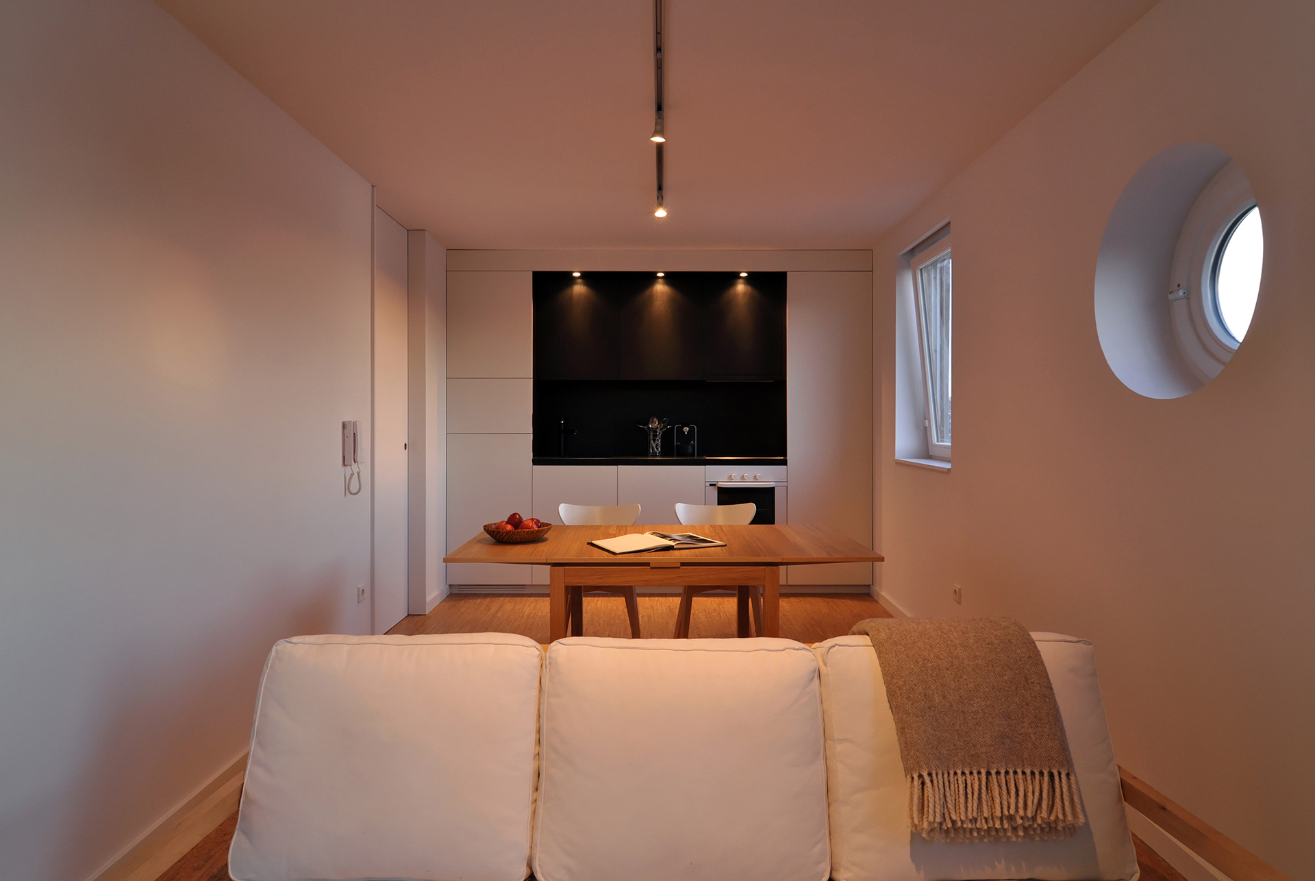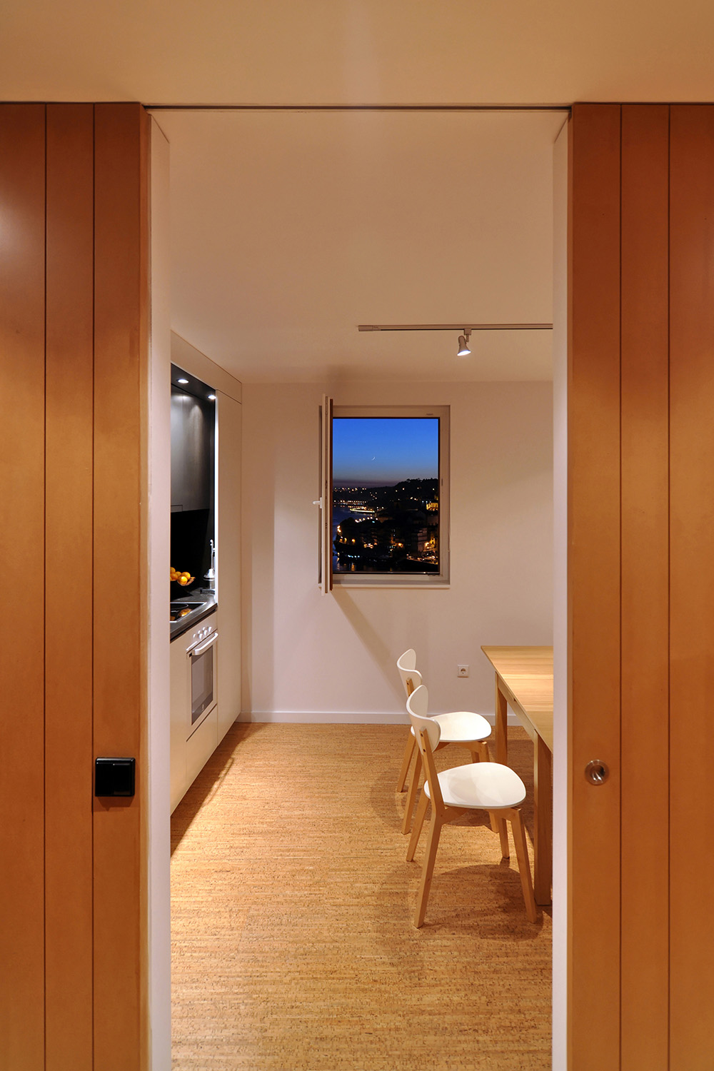Intervention: In this renovation the main intention was to open-up an over-compartmentalized space in an advanced state of degradation and redefine the different areas of the house. By using built-in cabinets as much as possible and integrating most of the necessary furniture and equipment into the architecture itself it was possible to enlarge each compartment and expand the sense of space. In the new spatial configuration there was an inversion of the original layout with the cooking/eating/living functions coming together in the same space (with the option of turning it in an extra bedroom through a sliding panels system), taking advantage of the unparalleled views of the Douro River and the Historic Centre of Porto classified by UNESCO as a World Heritage Site, while the sleeping quarters face the quiet street that goes down and up the hill. All compartments are now bathed by direct sunlight, bathroom and corridor included, and careful attention was given to the artificial light design, privileging indirect and spot lighting solutions. With respect to the materials used, there was a clear option for inexpensive materials like MDF boards varnished or painted for all the carpentry, locally produced cork flooring for the main spaces of the flat and slate stone pavement for the bathroom and stairs.