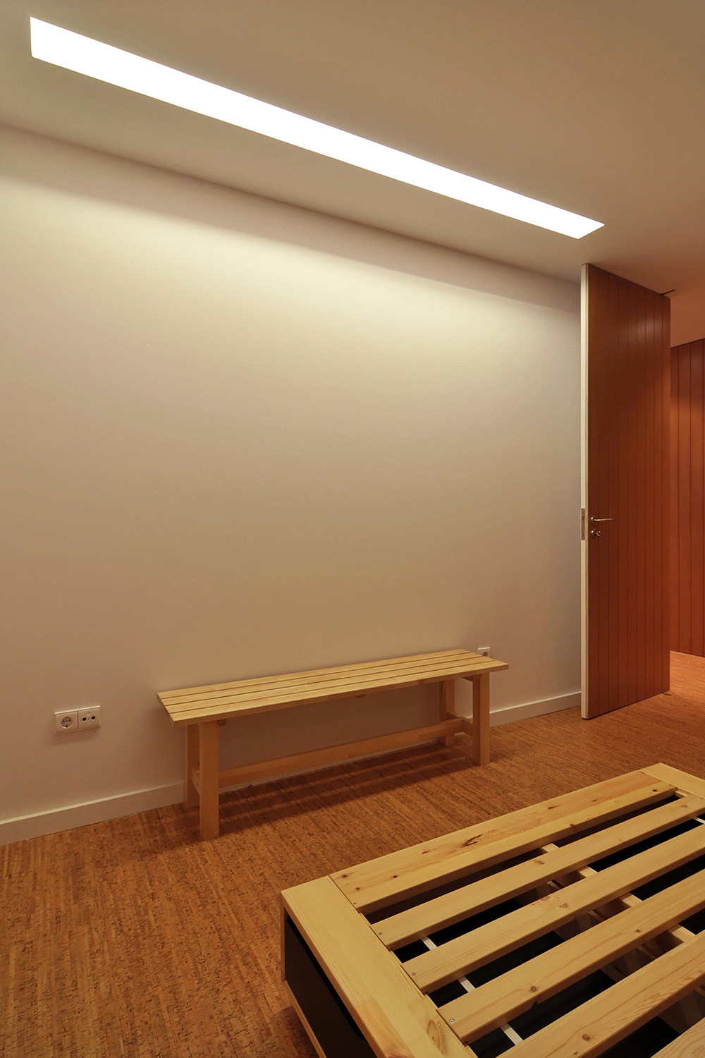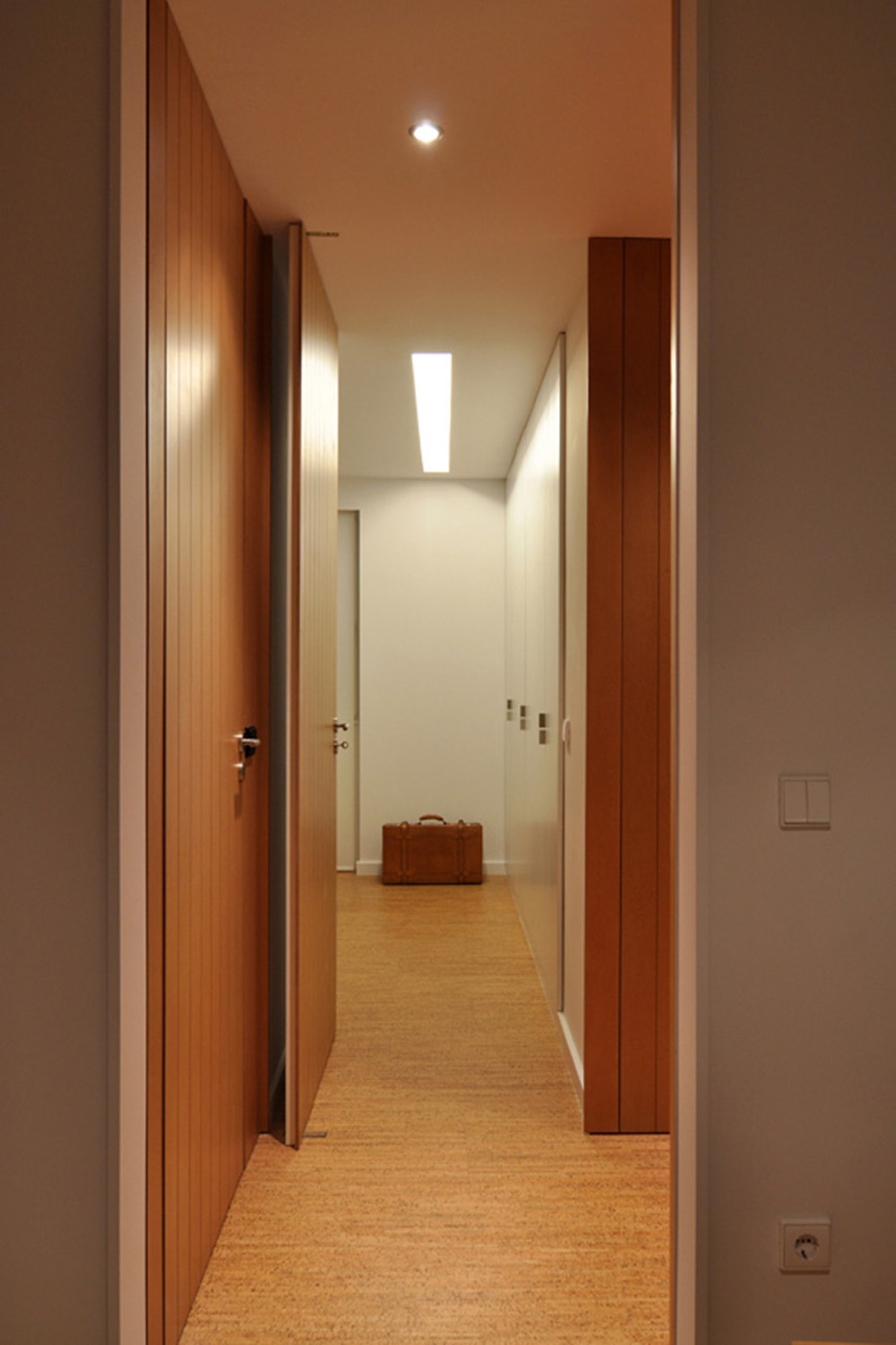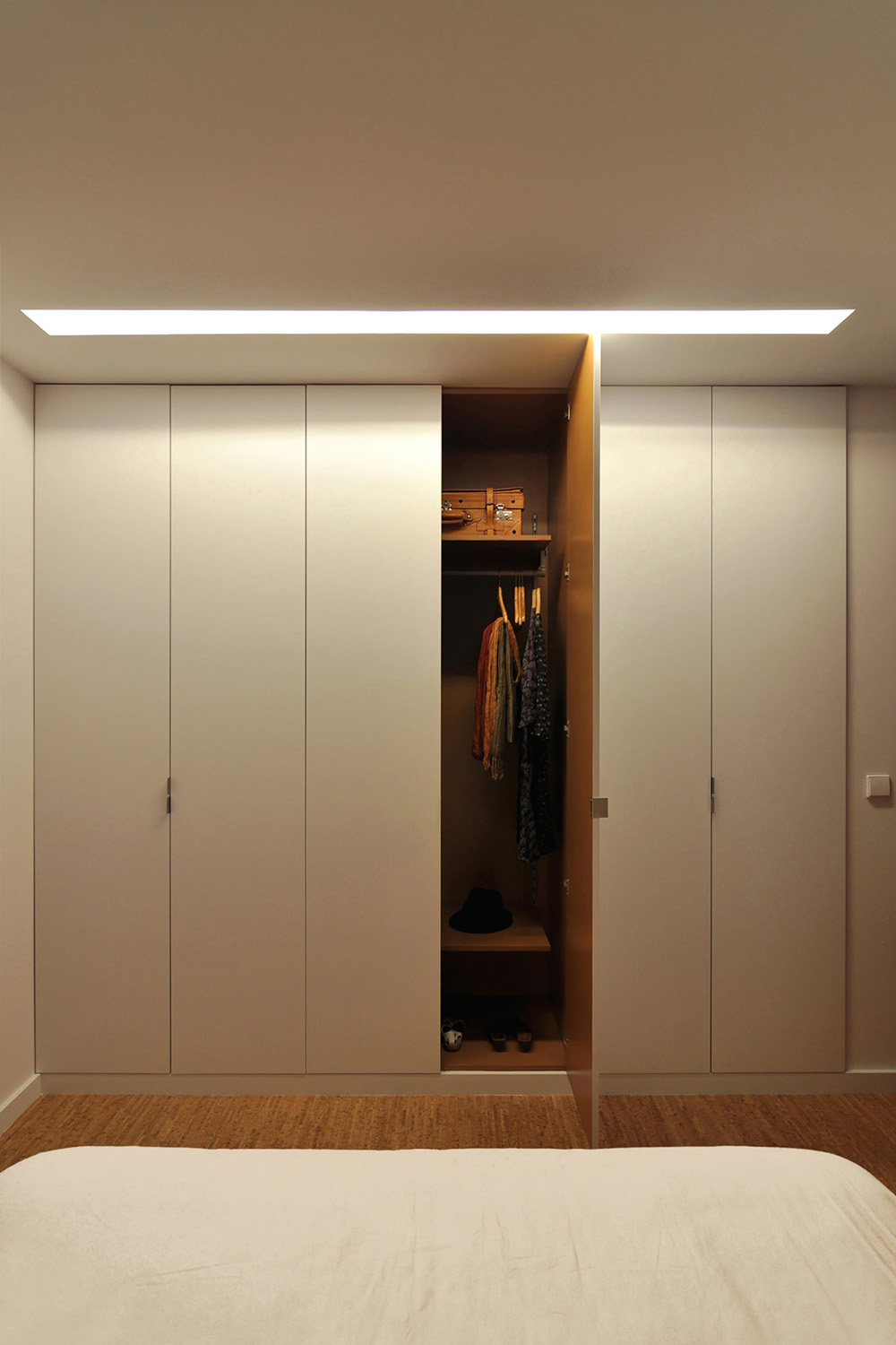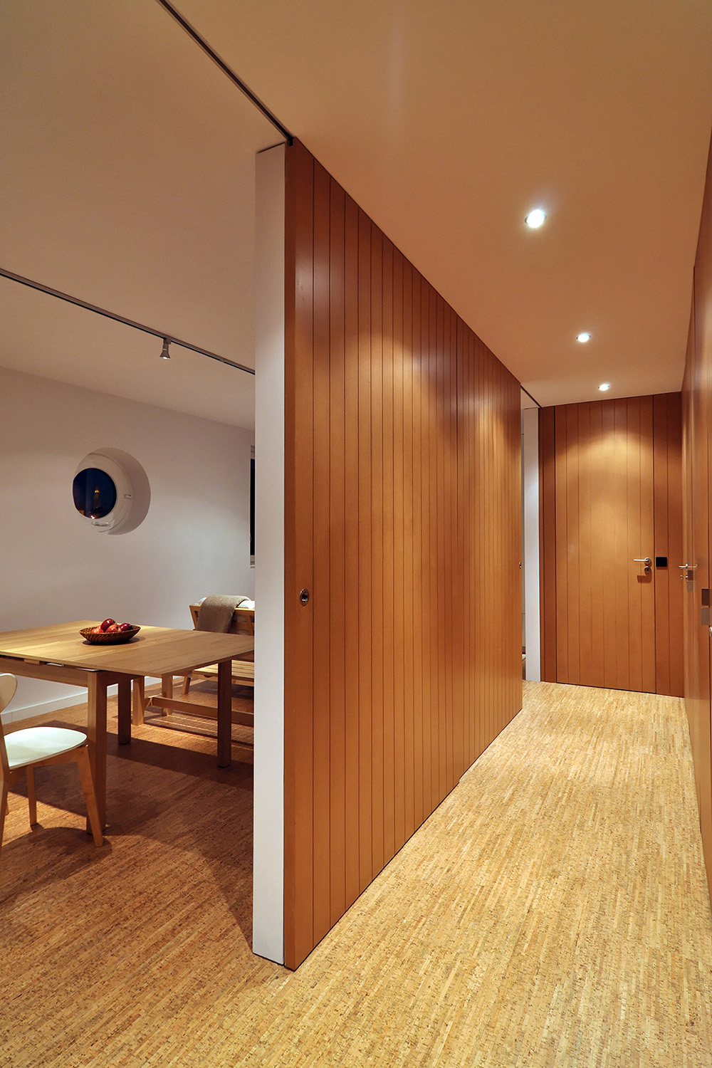 Intervention: In this renovation the main intention was to open-up an over-compartmentalized space in an advanced state of degradation and redefine the different areas of the house. By using built-in cabinets as much as possible and integrating most of the necessary furniture and equipment into the architecture itself it was possible to enlarge each compartment and expand the sense of space. In the new spatial configuration there was an inversion of the original layout with the cooking/eating/living functions coming together in the same space (with the option of turning it in an extra bedroom through a sliding panels system), taking advantage of the unparalleled views of the Douro River and the Historic Centre of Porto classified by UNESCO as a World Heritage Site, while the sleeping quarters face the quiet street that goes down and up the hill. All compartments are now bathed by direct sunlight, bathroom and corridor included, and careful attention was given to the artificial light design, privileging indirect and spot lighting solutions. With respect to the materials used, there was a clear option for inexpensive materials like MDF boards varnished or painted for all the carpentry, locally produced cork flooring for the main spaces of the flat and slate stone pavement for the bathroom and stairs.