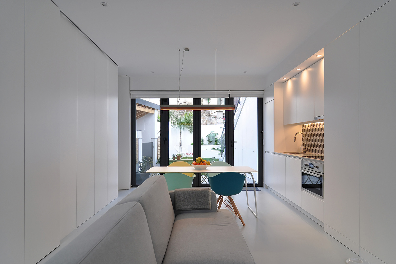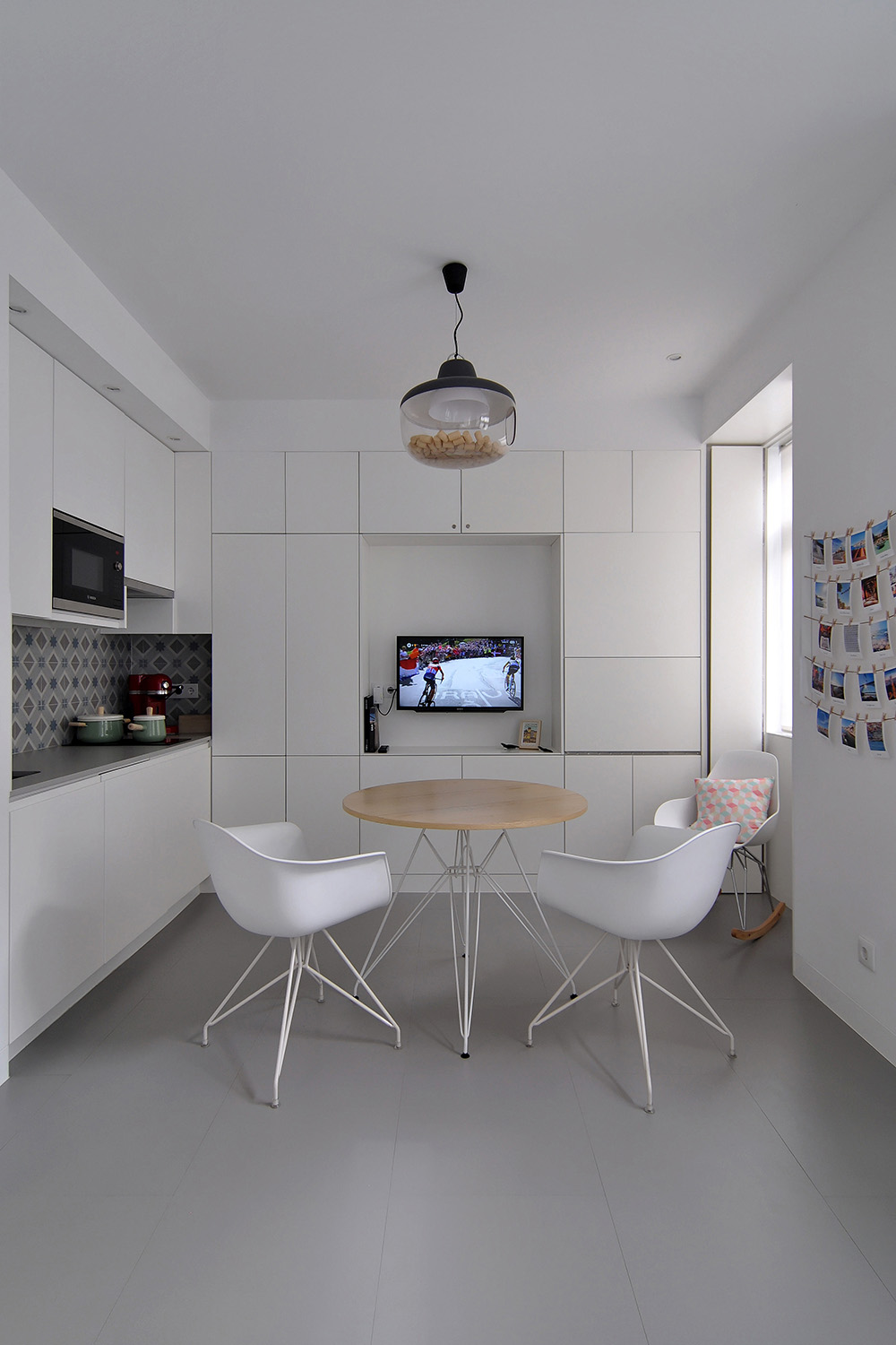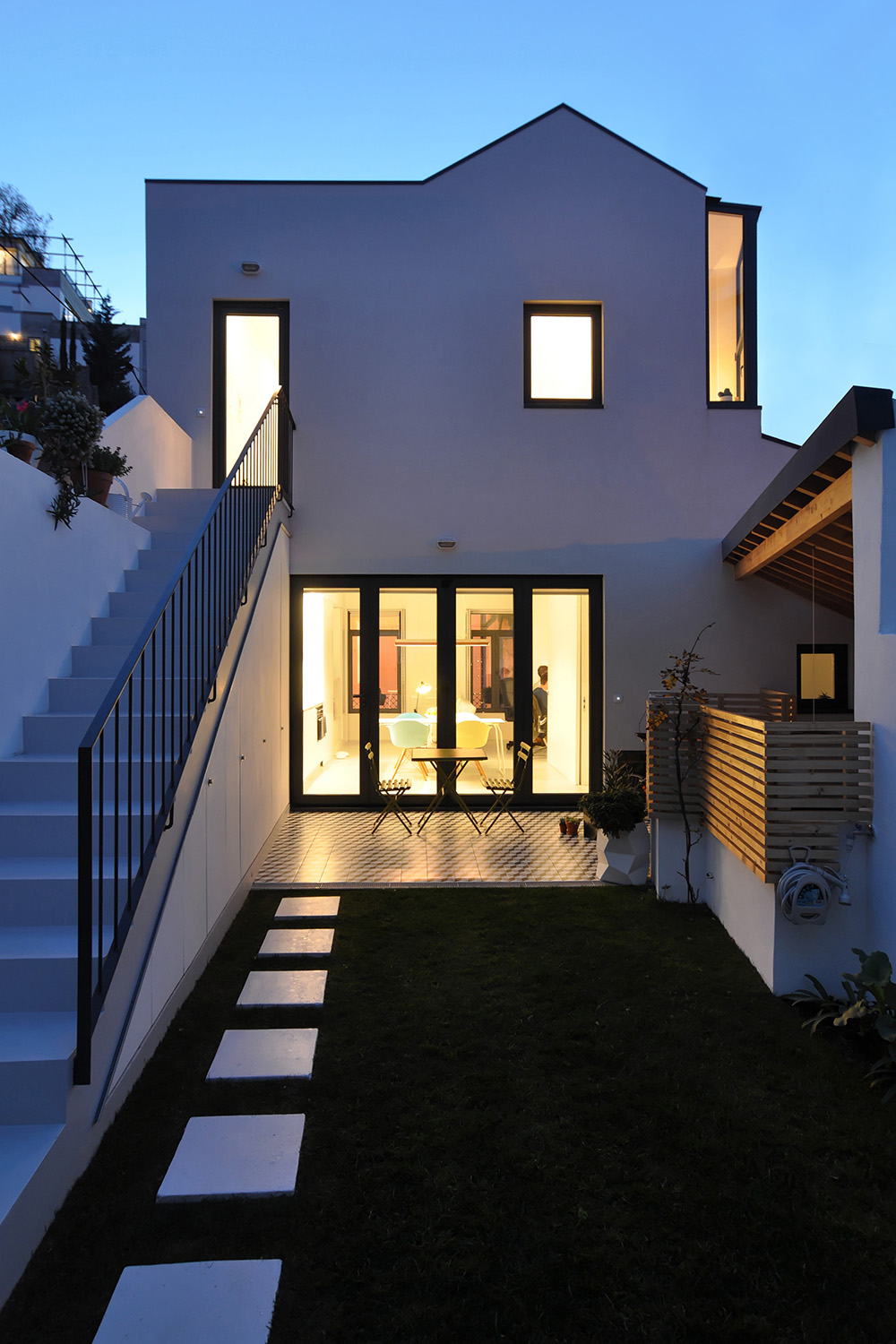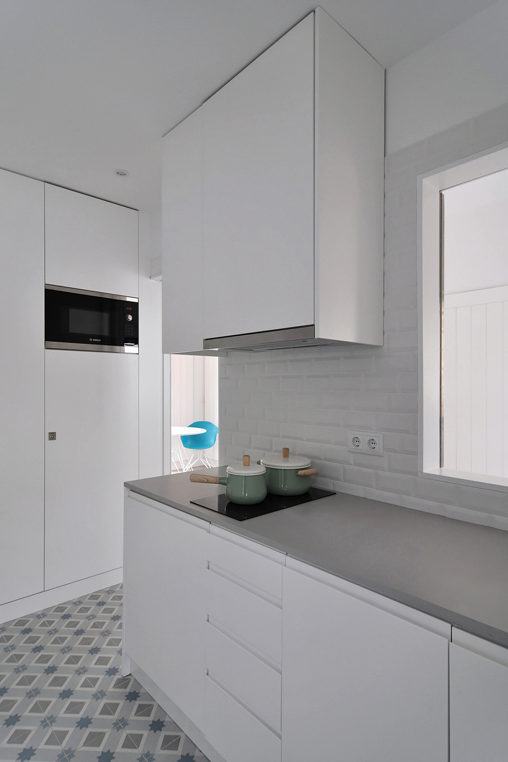 Following the clients’ intentions of simplicity, the material pallete is very restrained with white (walls, ceilings and built in furniture) and different tones of grey (granite on the main façade, self-leveling floors, kitchen and bathroom counters) being the most present tones in the overall atmosphere punctuated by coloured furniture and traditional elements (hand made tiles on the main façade, patterned ceramic tiles on the terraces and kitchens).