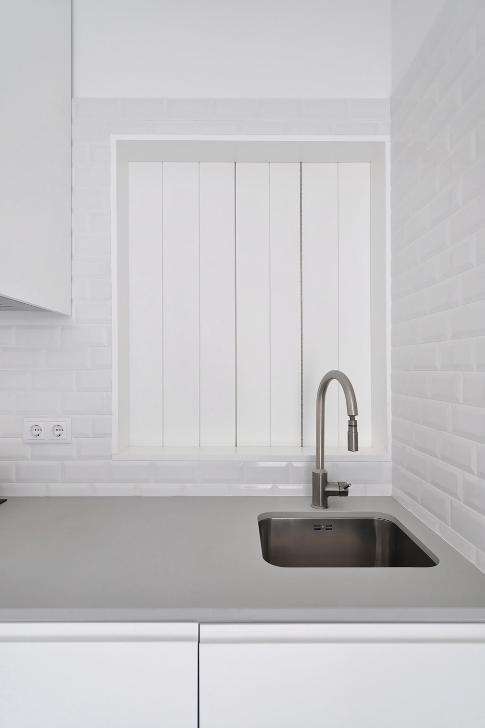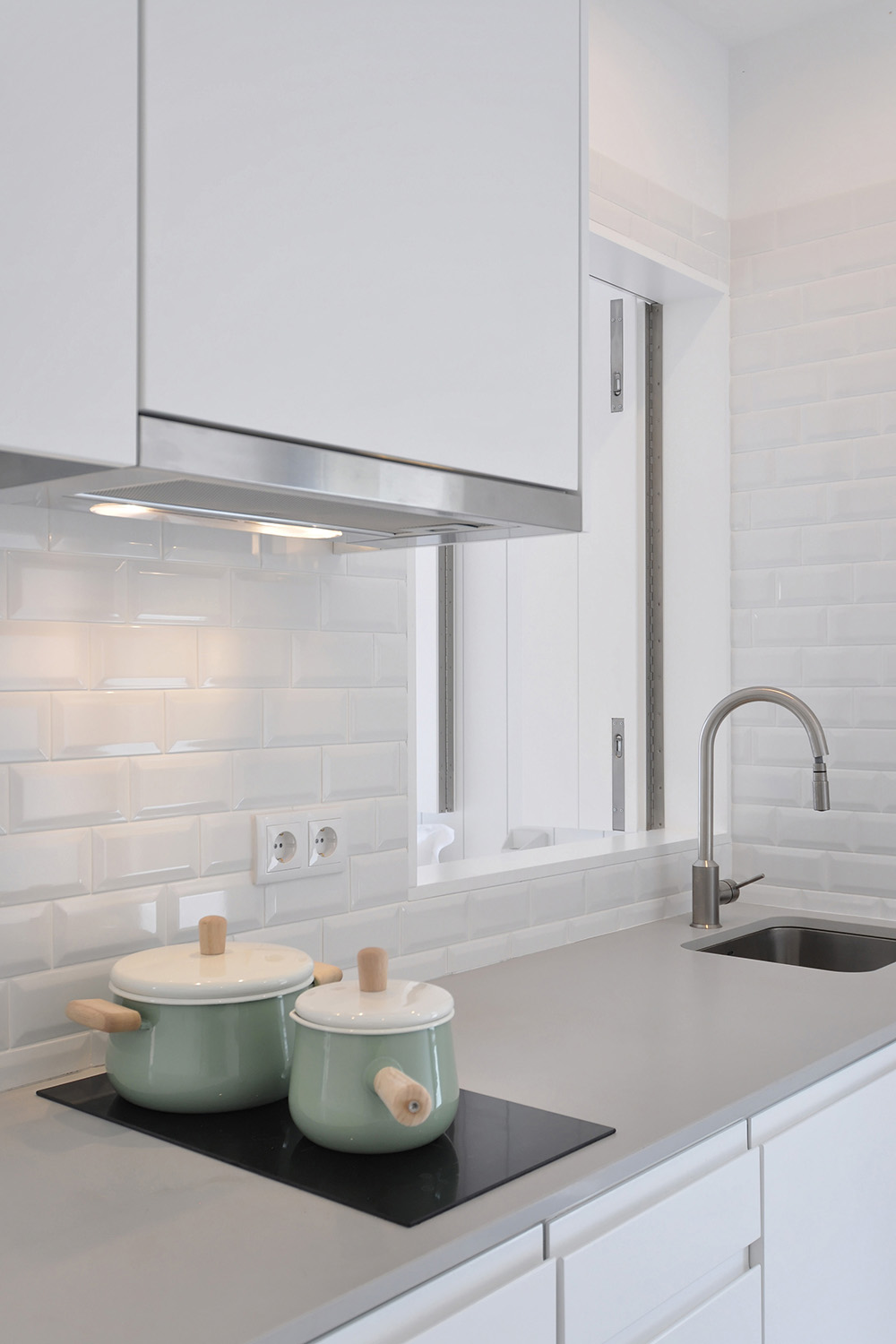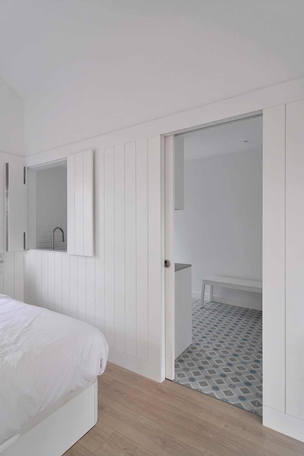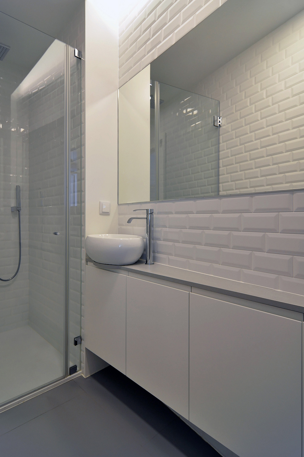 Following the clients’ intentions of simplicity, the material pallete is very restrained with white (walls, ceilings and built in furniture) and different tones of grey (granite on the main façade, self-leveling floors, kitchen and bathroom counters) being the most present tones in the overall atmosphere punctuated by coloured furniture and traditional elements (hand made tiles on the main façade, patterned ceramic tiles on the terraces and kitchens).