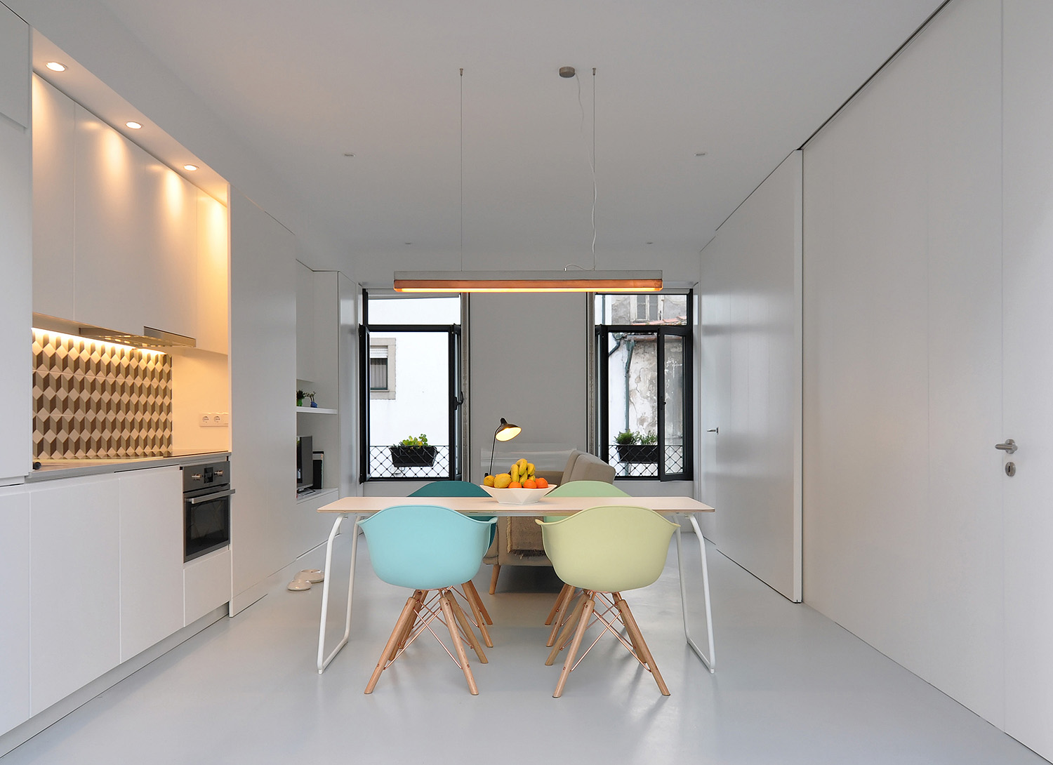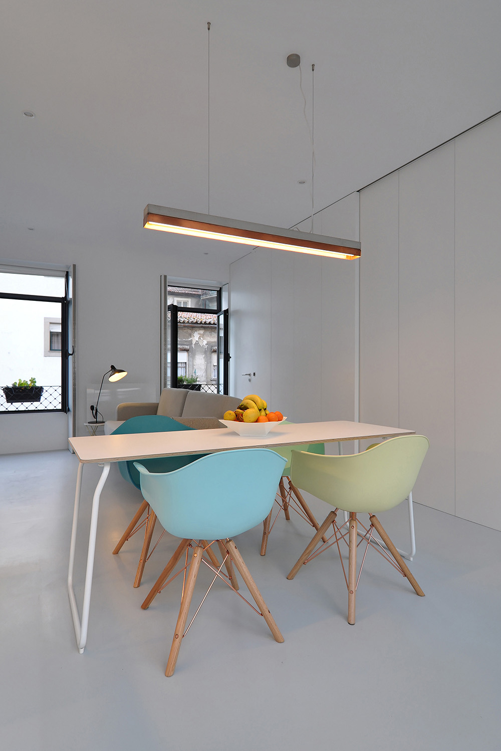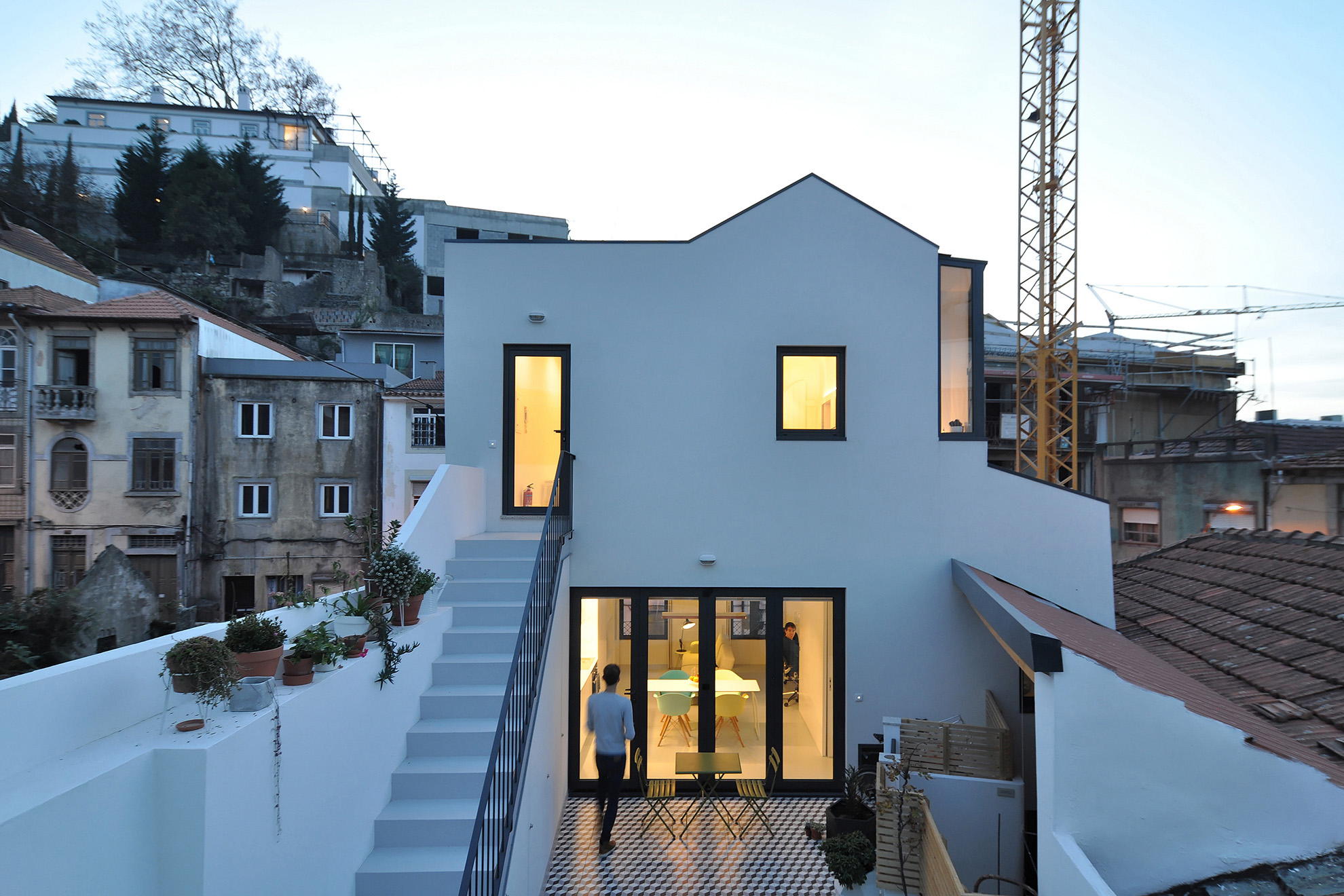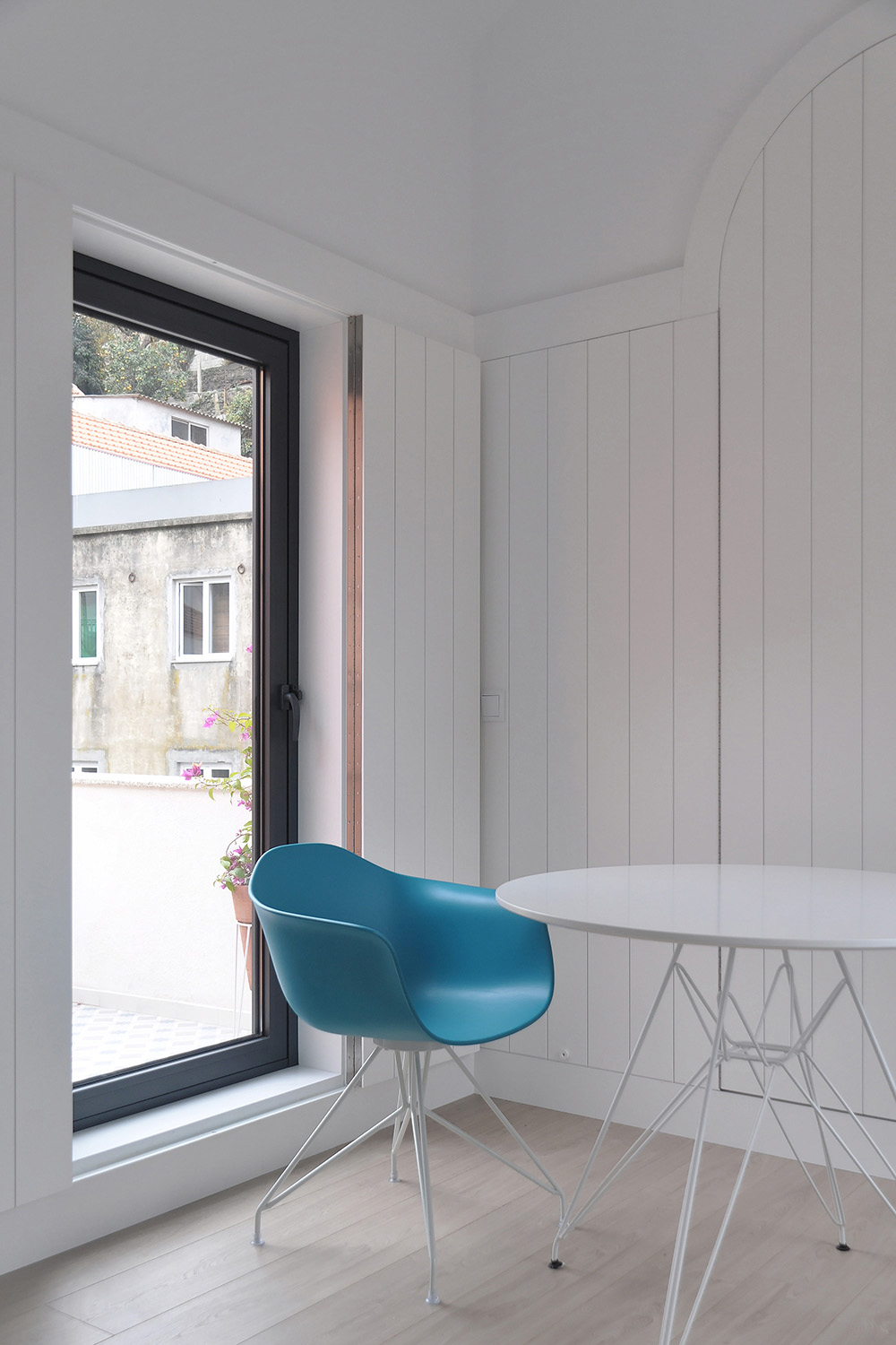 On the upper floor, accessible via an exterior staircase, the intention was to explore the apartment’s unique views over Porto’s World Heritage Site by implanting two symmetrical terraces on the roof while reinforcing the pre-existing axis of the gabled roof central space that accommodates the living-dining-sleeping functions and leaving the more “technical” areas to the sides, the kitchen and the bathroom.