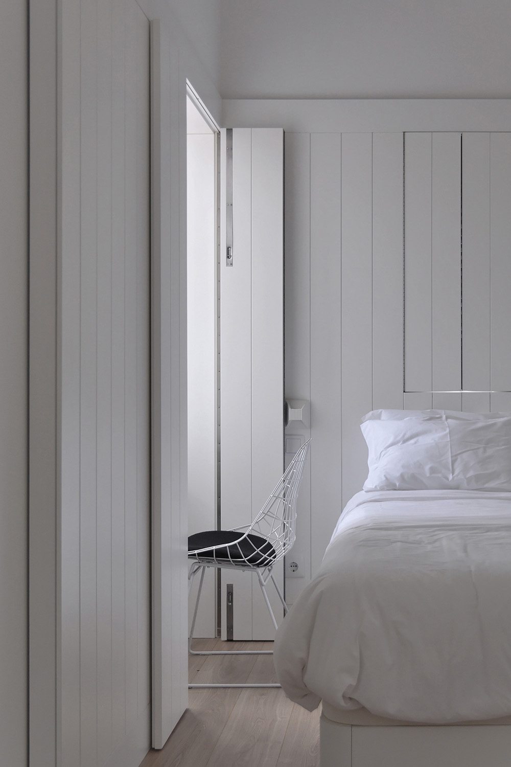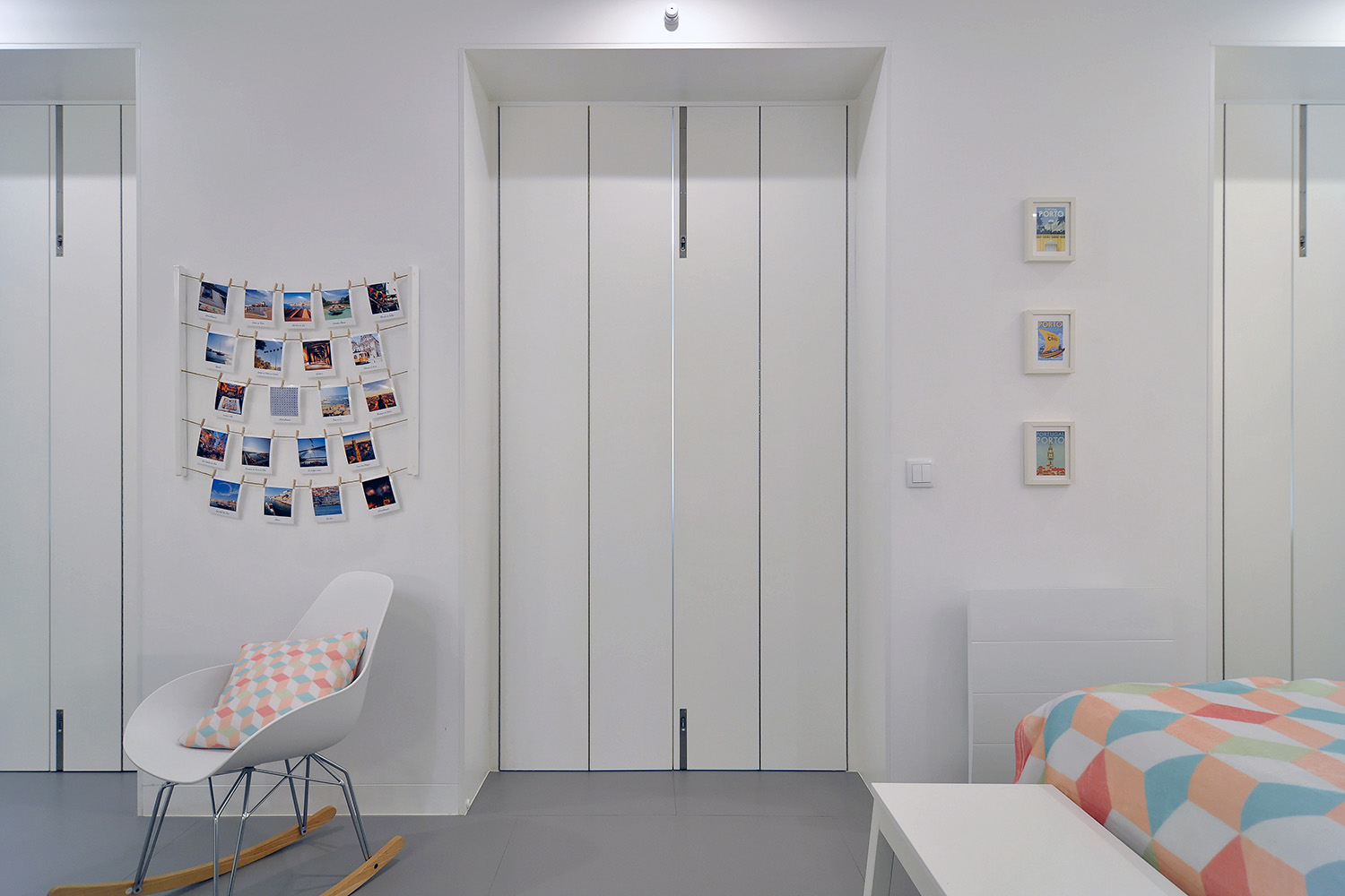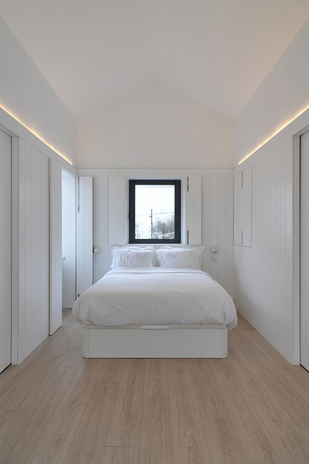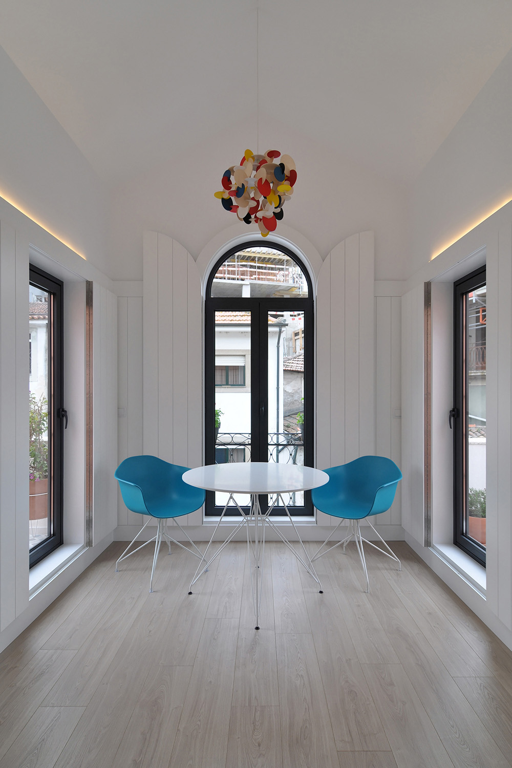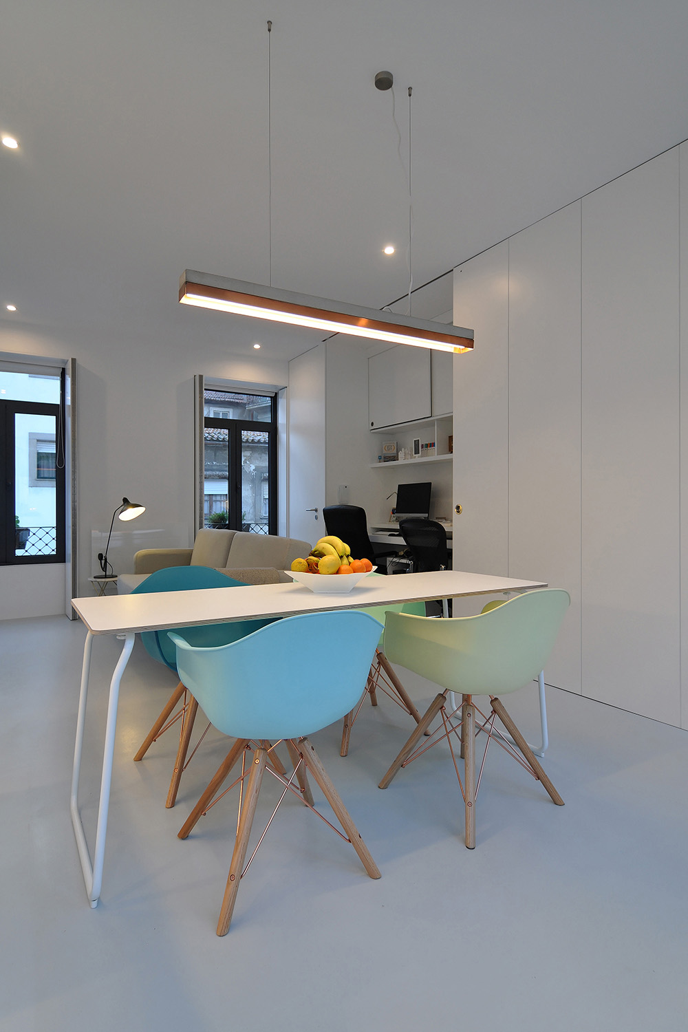 On the upper floor, accessible via an exterior staircase, the intention was to explore the apartment’s unique views over Porto’s World Heritage Site by implanting two symmetrical terraces on the roof while reinforcing the pre-existing axis of the gabled roof central space that accommodates the living-dining-sleeping functions and leaving the more “technical” areas to the sides, the kitchen and the bathroom.