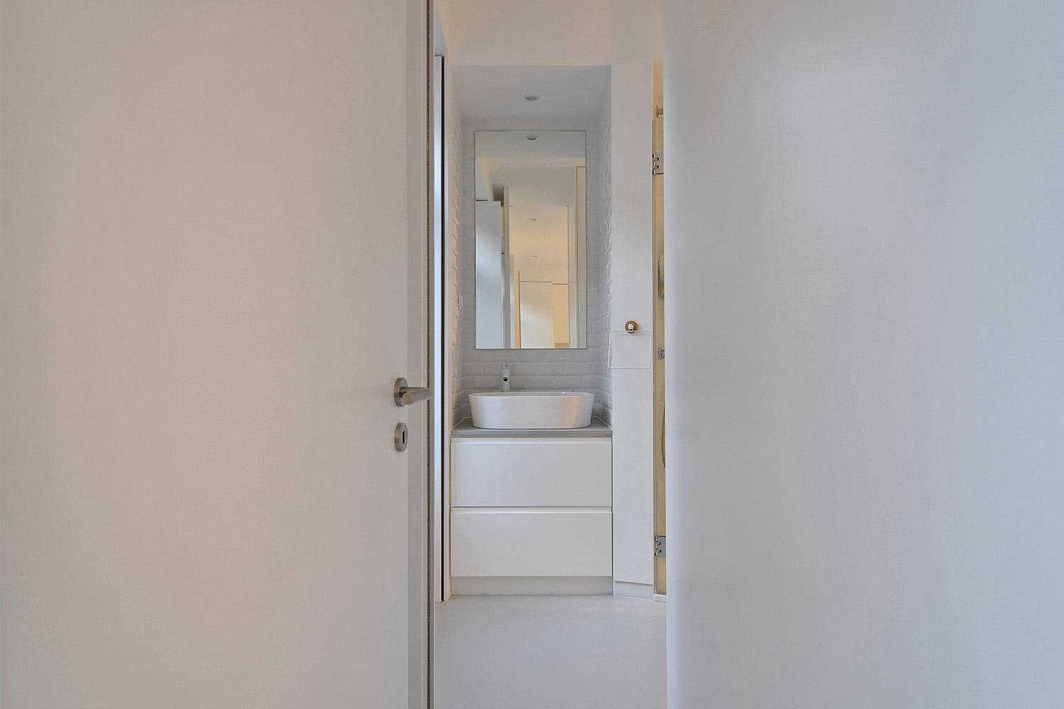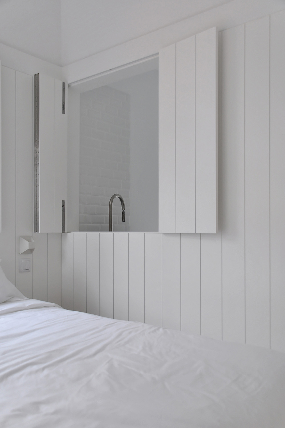 On the ground floor flat, the most compact of the three, there are just two compartments: a bathroom and an open space containing kitchenette, living/ dining and bedroom facing the street.