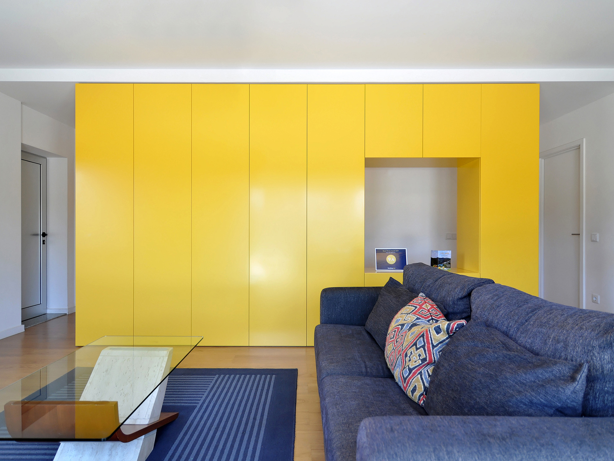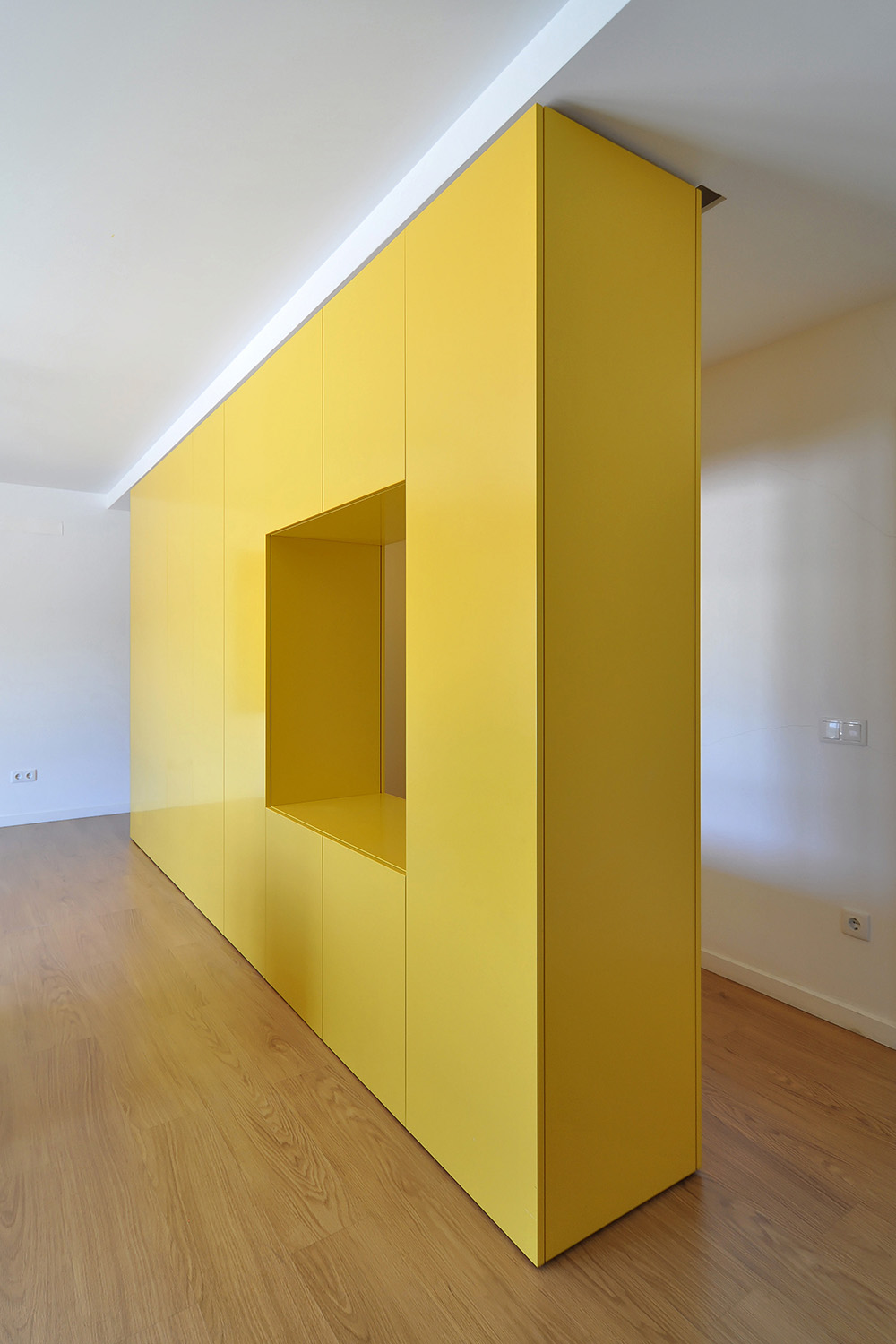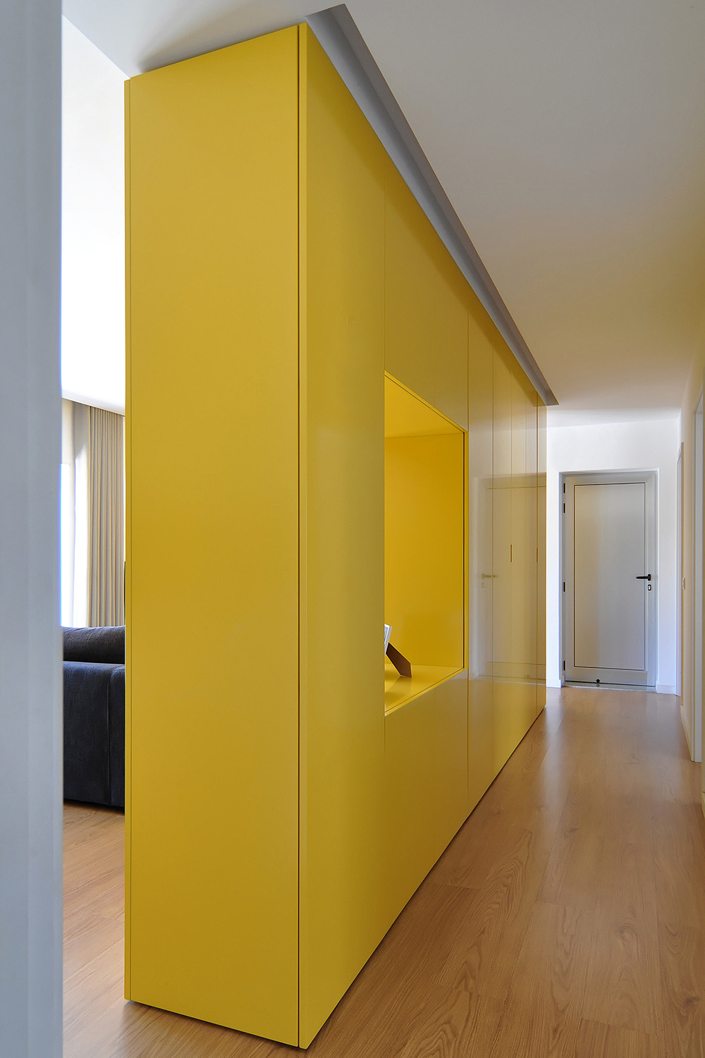 Located next to the river Douro and with a large west-facing terrace it was imperative to "flip" the previous layout in order to connect the new common spaces of the flat with the views and the sunny exterior space while turning the bedrooms to the quiet street. An open space featuring the kitchen, the dining and the living rooms is set along the terrace and a large balcony window was opened on the façade to allow for sunlight and views of the river while a strategically placed yellow cupboard is used as a filtering element between these areas and the three new more compact bedrooms, forming a kind of an open corridor that connects all of these spaces to the bathroom without the need for more doors. A brighter atmosphere than the previous one was sought so lighter tones and materials were chosen for all the areas.