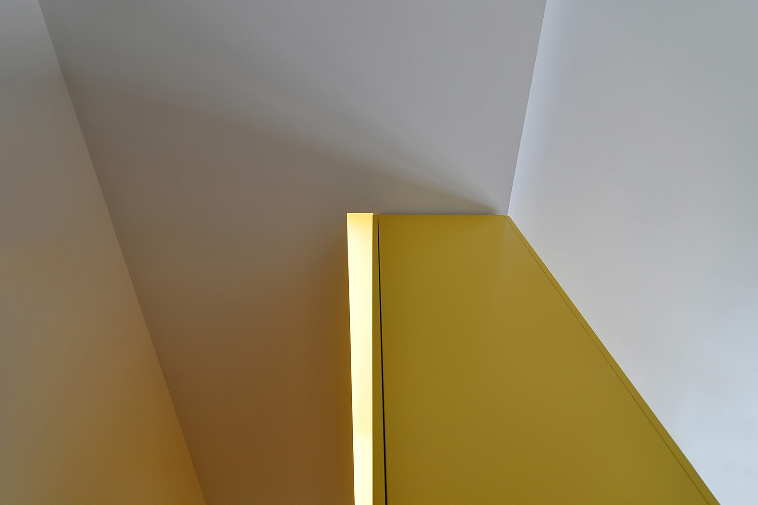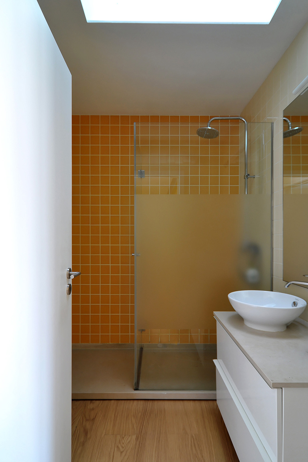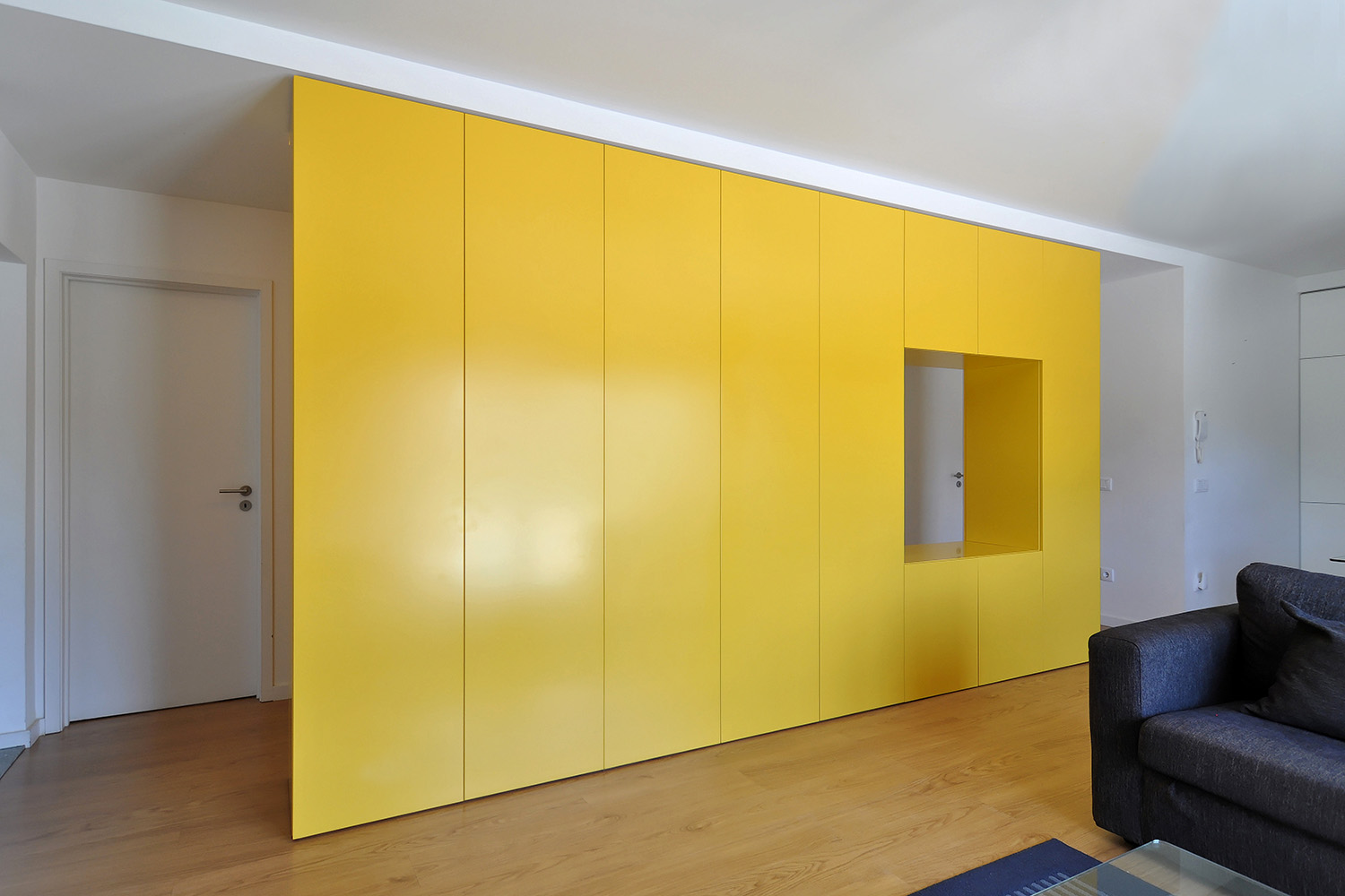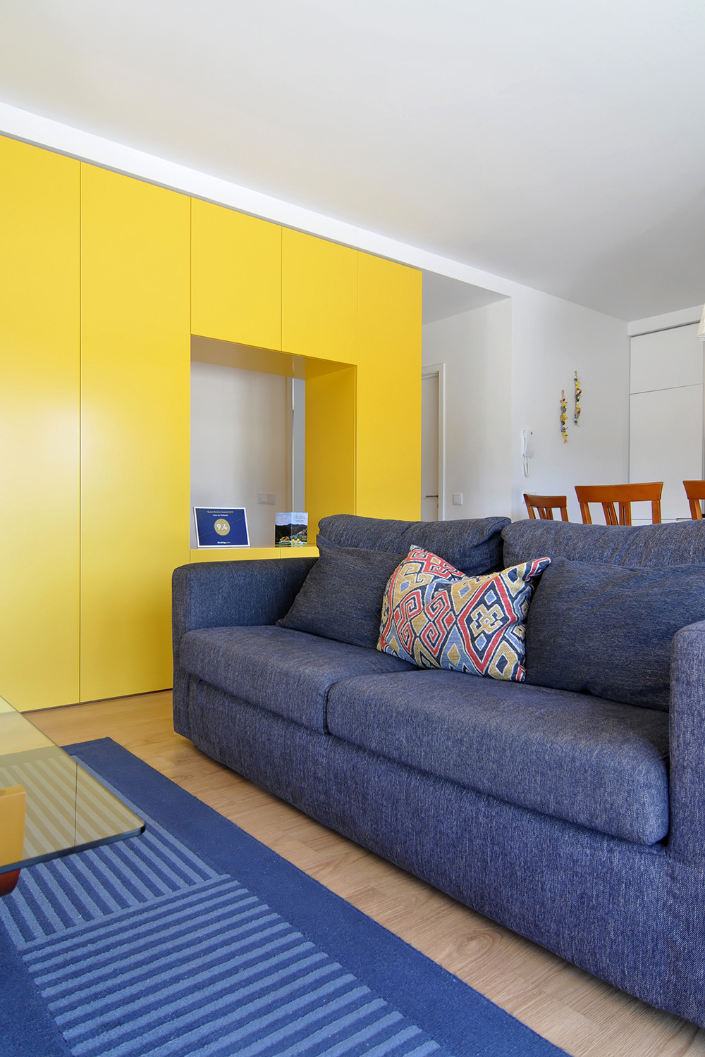 Located next to the river Douro and with a large west-facing terrace it was imperative to "flip" the previous layout in order to connect the new common spaces of the flat with the views and the sunny exterior space while turning the bedrooms to the quiet street. An open space featuring the kitchen, the dining and the living rooms is set along the terrace and a large balcony window was opened on the façade to allow for sunlight and views of the river while a strategically placed yellow cupboard is used as a filtering element between these areas and the three new more compact bedrooms, forming a kind of an open corridor that connects all of these spaces to the bathroom without the need for more doors. A brighter atmosphere than the previous one was sought so lighter tones and materials were chosen for all the areas.