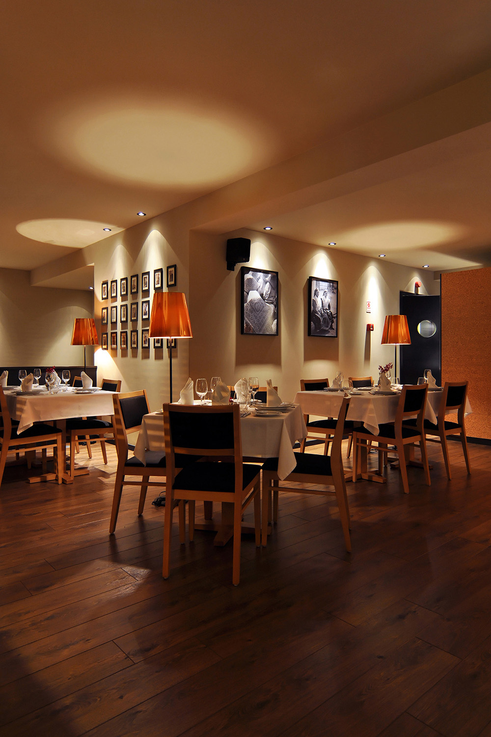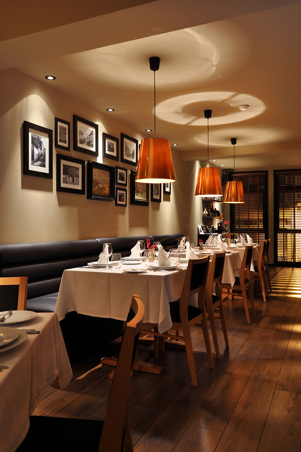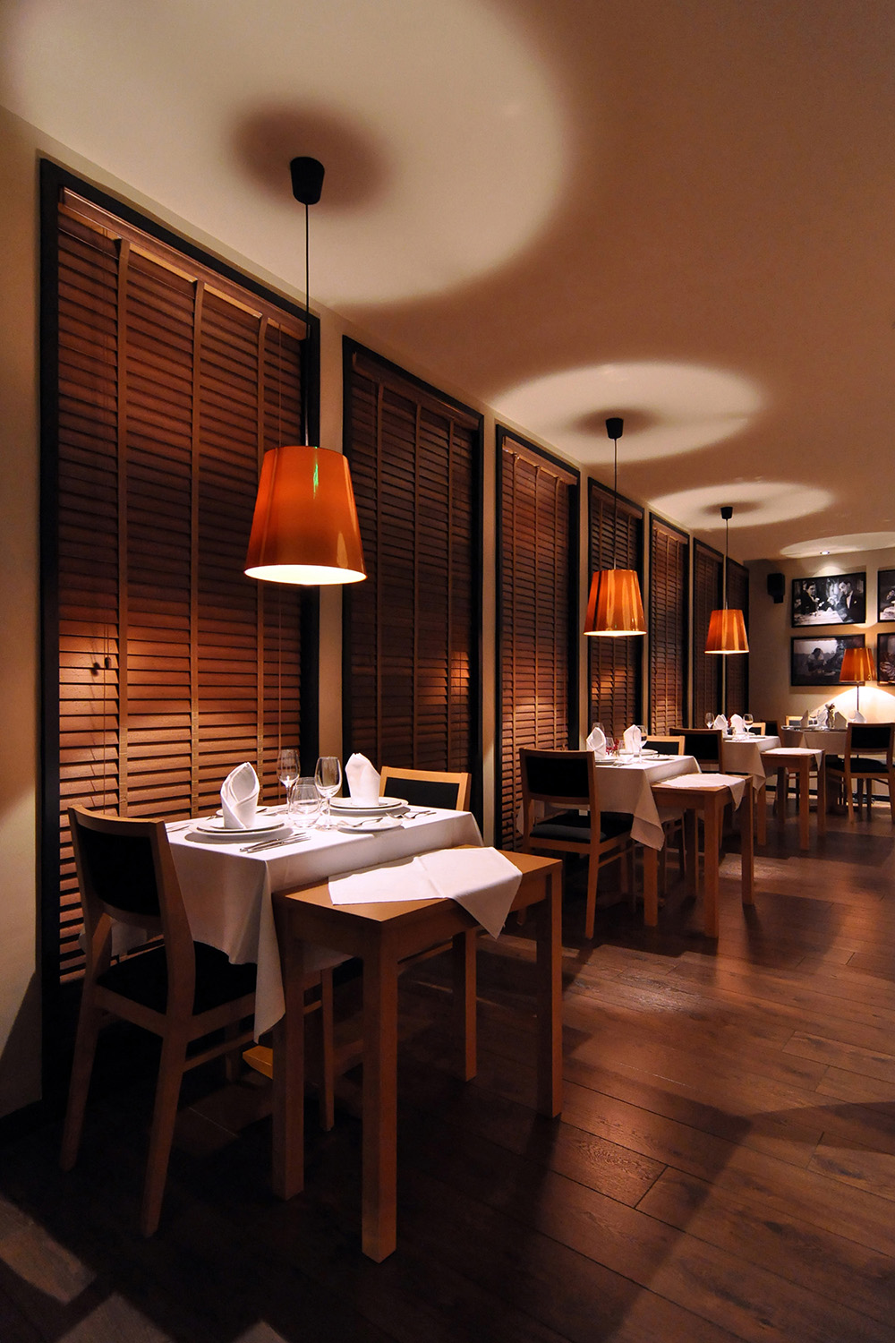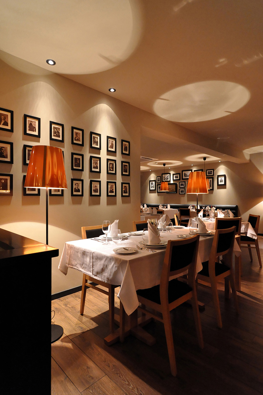 On the Restaurant a lighter setting but still maintaining the same kind of atmosphere, by using the same colours and materials and punctuating the spaces with pictures of famous Hungarian personalities and places.