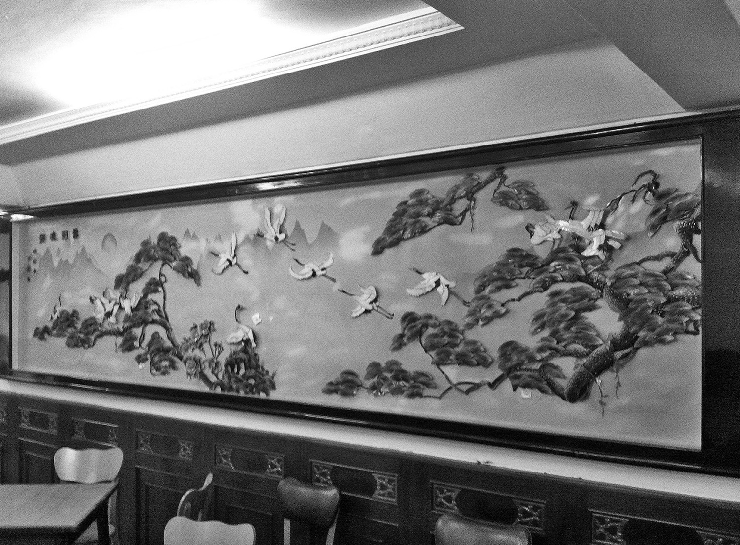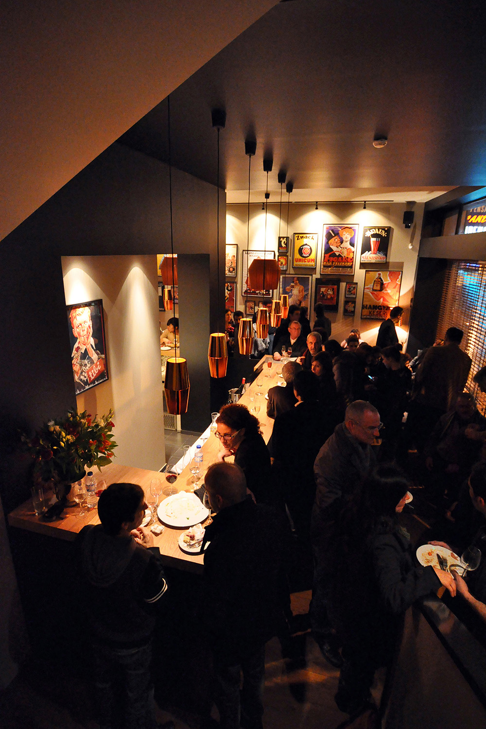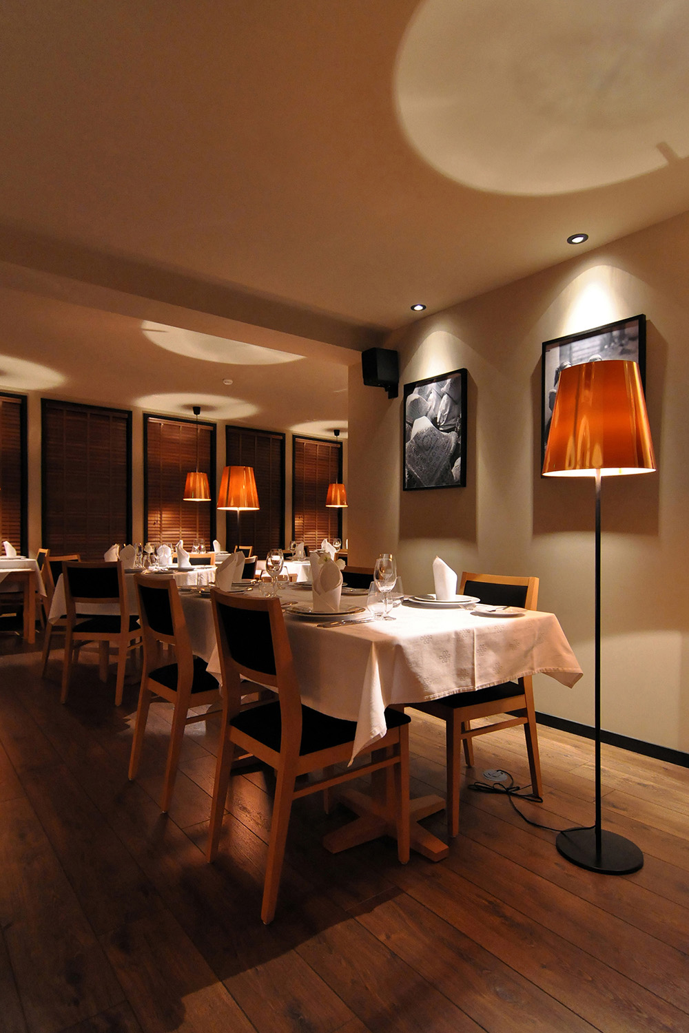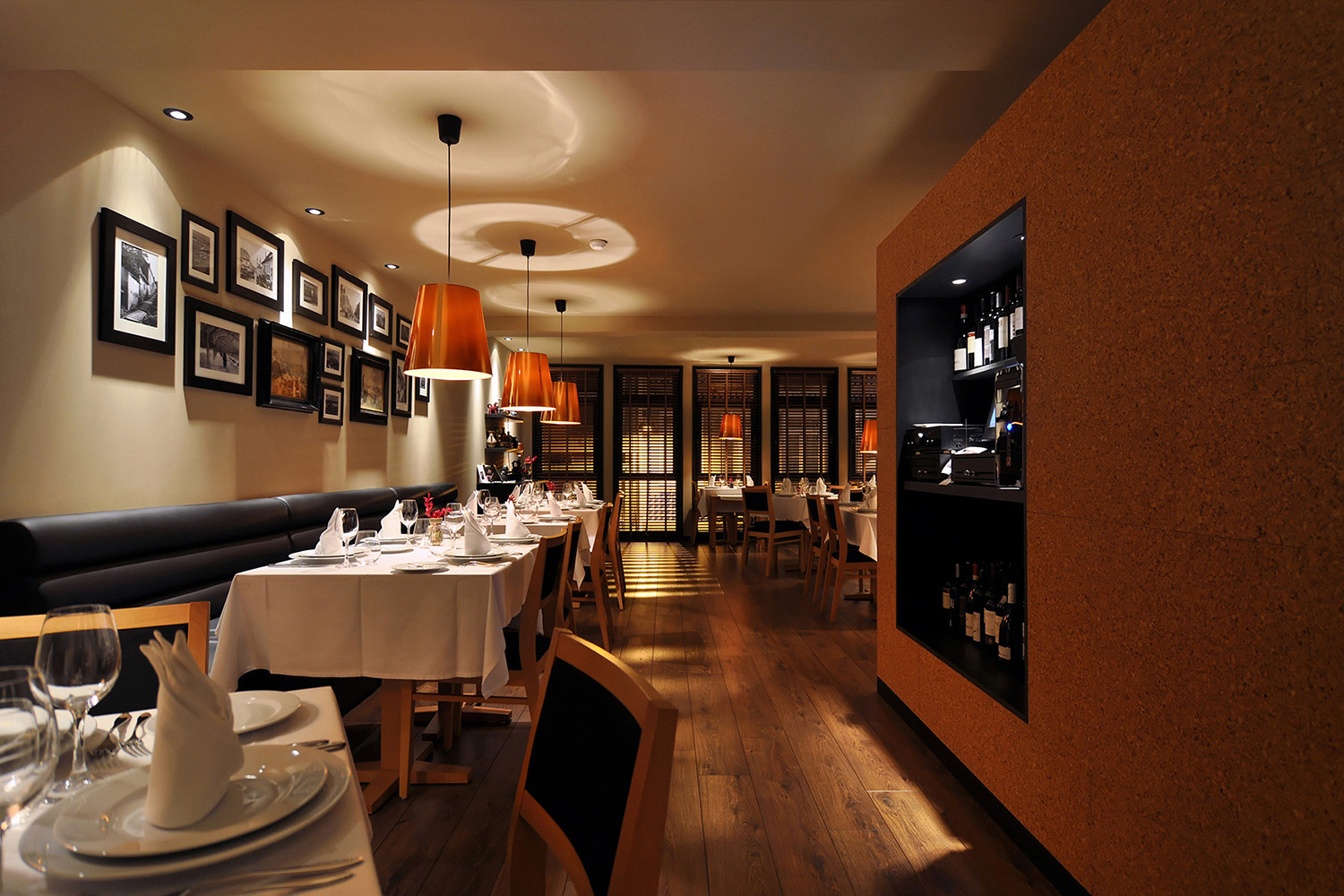 On the Restaurant a lighter setting but still maintaining the same kind of atmosphere, by using the same colours and materials and punctuating the spaces with pictures of famous Hungarian personalities and places.