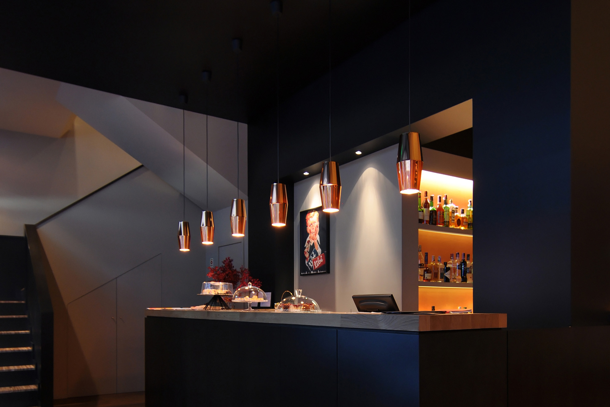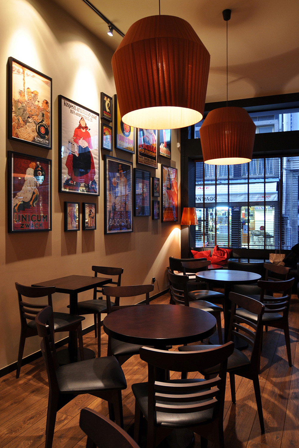 On the Café-Bar, a more relaxed ambiance was sought, accommodating customers at the counter, on tables and on sofas and emphasizing the night-time use by dimming the lights and accentuating the darker colours, adding a touch of Hungarian popular culture by filling the walls with old posters of coffee and drinks.