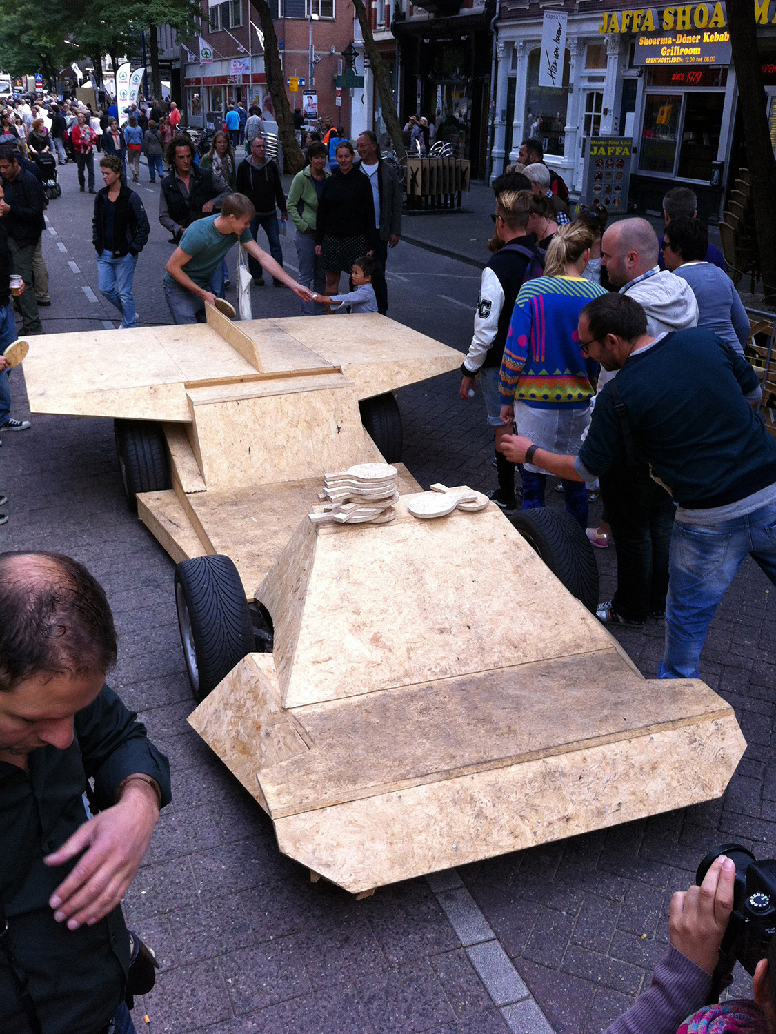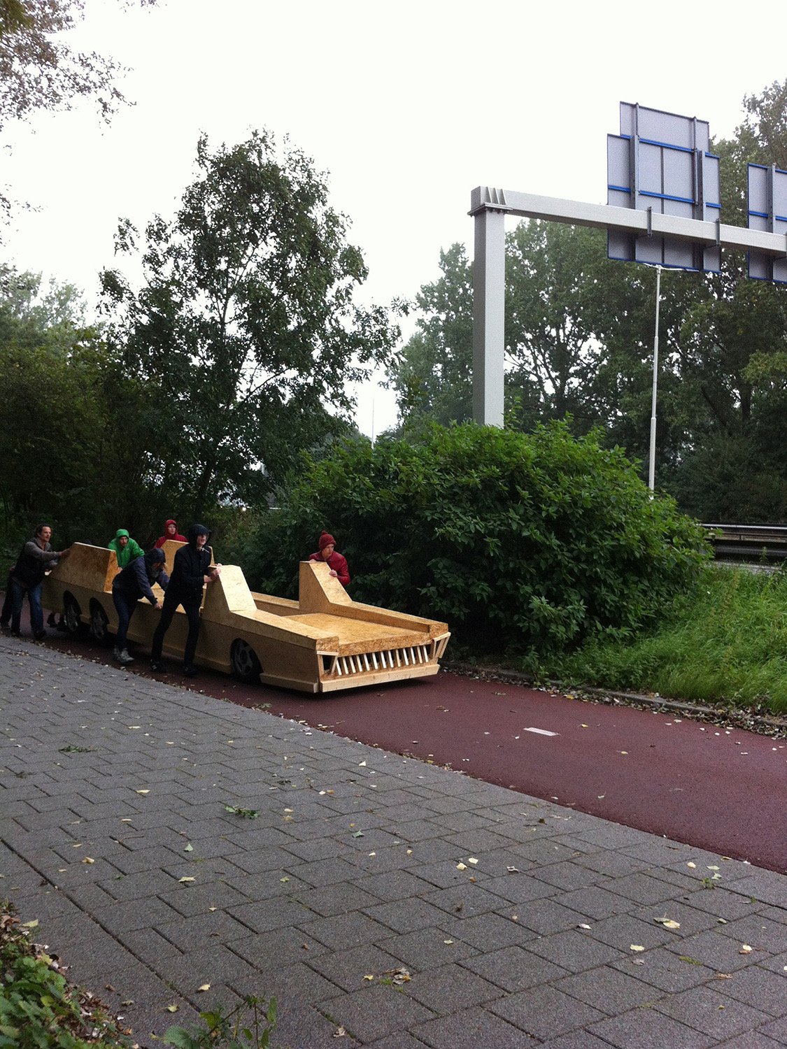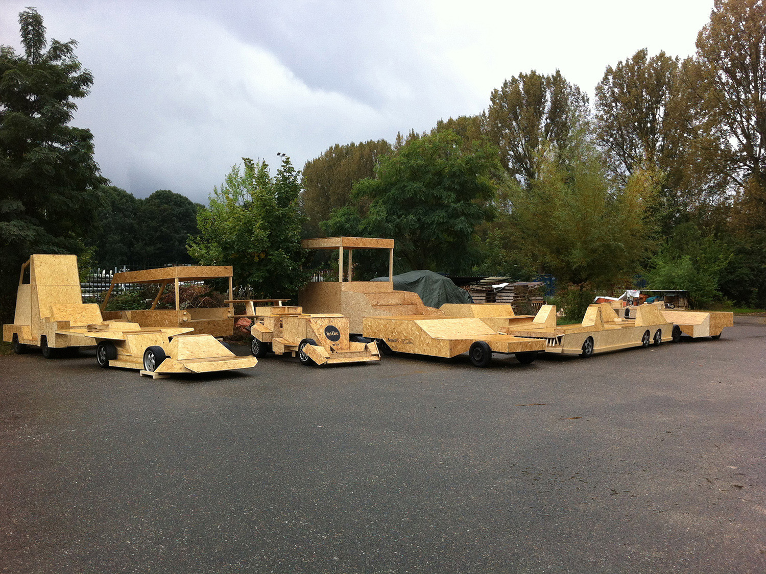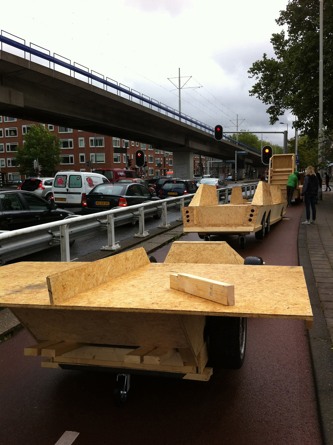 Description: The 2012 De Wereld van Witte de With Festival entitled "The Street – Live Issue!" invited Raumlabor to rethink the Witte de With Straat, blocked for traffic for the duration of the event for first time. The cars usually parked and moving along the street were replaced by several mock-up vehicles with different functions and configurations related to the festival's main topic.